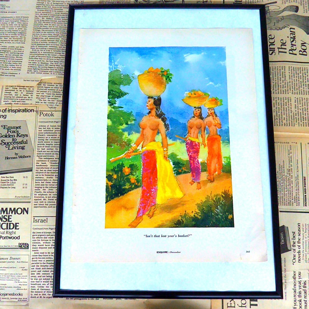 このイラストは、鮮やかな色彩で描かれた南国風の風景の中、上半身が裸で腰に鮮やかな布を巻いた女性たちが、頭の上に大きなバスケットを乗せて歩いている様子をユーモラスに描いています。イラストの下には“Isn't that last year's basket?”(「それ、去年のカゴじゃない?」)というキャプションが添えられており、日常的な会話の一コマのような親しみやすさと、少し皮肉めいたユーモアが感じられます。この作品は、当時の雑誌(ESQUIRE)の持つ洒脱な風刺精神や異国情緒の演出がうかがえる、装飾性の高い一枚です。女性たちの堂々とした姿や色彩の対比、背景の自然描写が美しく、部屋に飾れば異国の空気を感じさせるアートピースとなります。