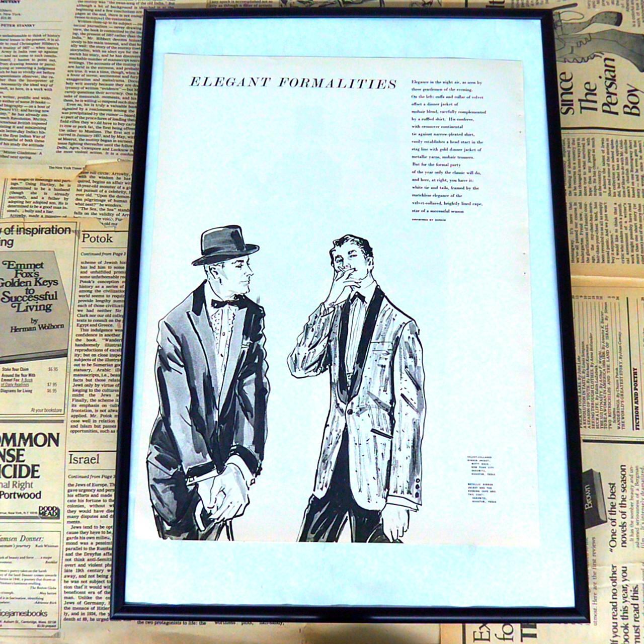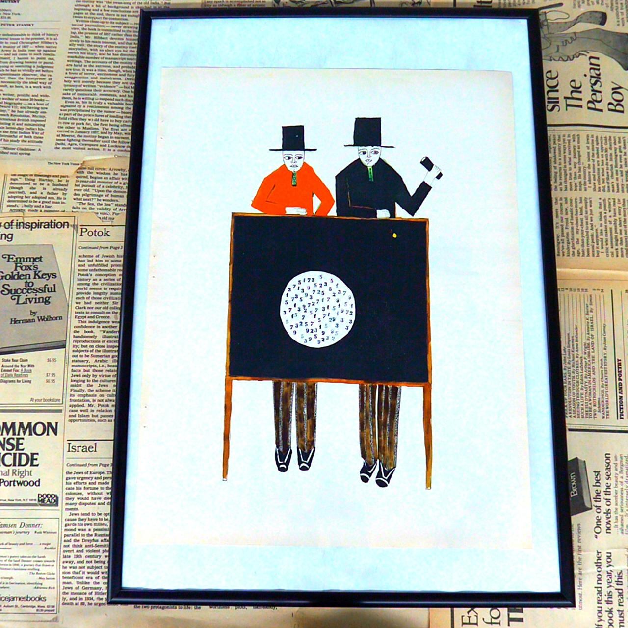 このイラストは、シンプルな線とカラフルな配色で描かれた二人の人物が特徴的です。二人とも黒い高帽子をかぶり、ひとりは赤い服、もうひとりは黒い服を着ています。彼らは腰の高さほどの黒いボードの後ろに立っており、ボード中央には白い円が描かれ、その中にランダムに数字が並んでいます。数字は7や3、5などが規則性なく配置されており、ミステリアスな印象を与えます。黒い服の人物は片手に何か小さな物を持ち、もう一方の手は胸元に置かれています。イラスト全体からは、抽象的でシュールな雰囲気が感じられ、見る人の想像力をかき立てる作品です。数字の羅列や無表情な人物の組み合わせが、どこか風刺的でユーモラスな印象をも与えています。インテリアとして飾ることで、空間に独特のアート性と遊び心を加えてくれる一枚です。