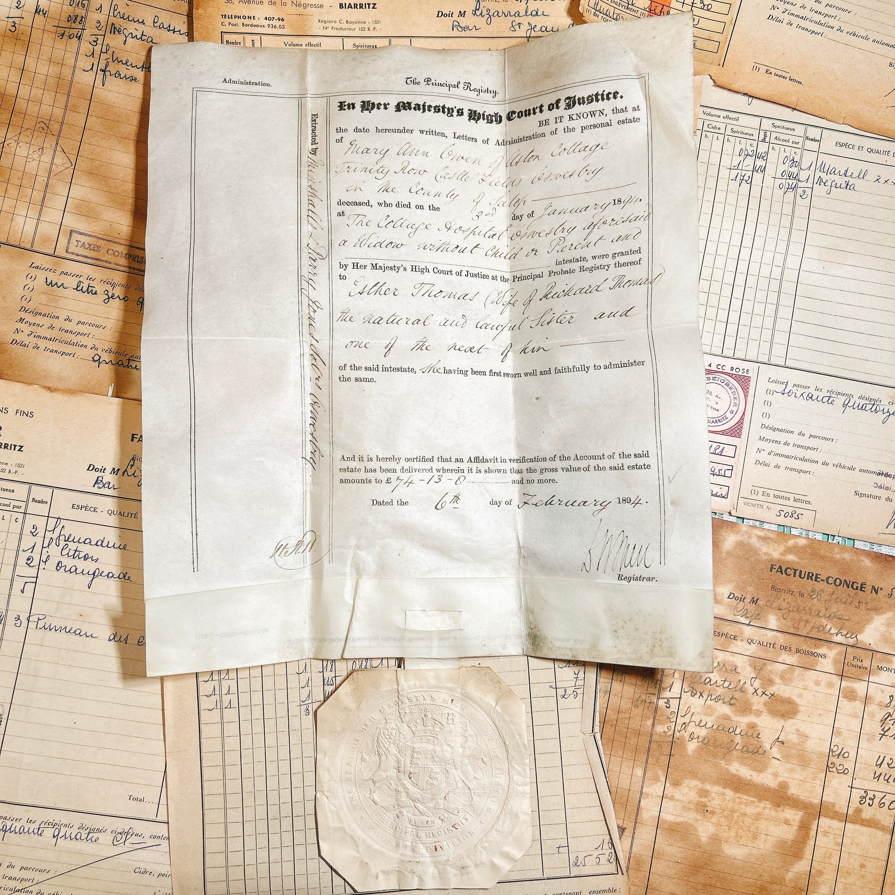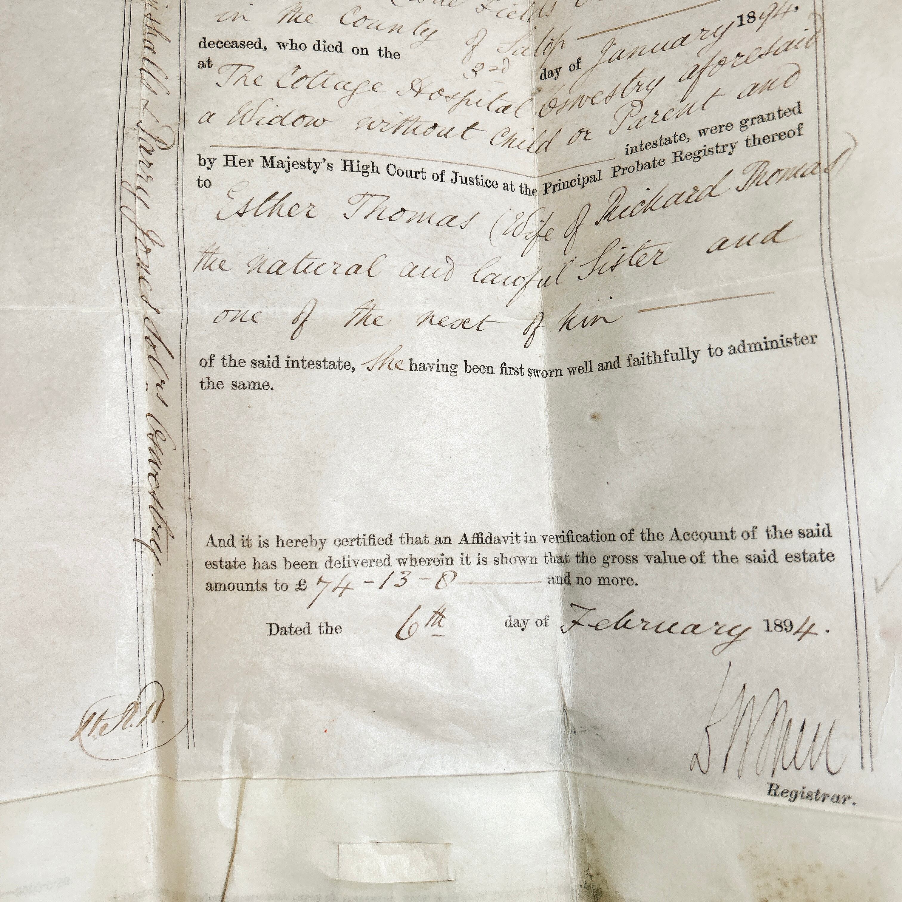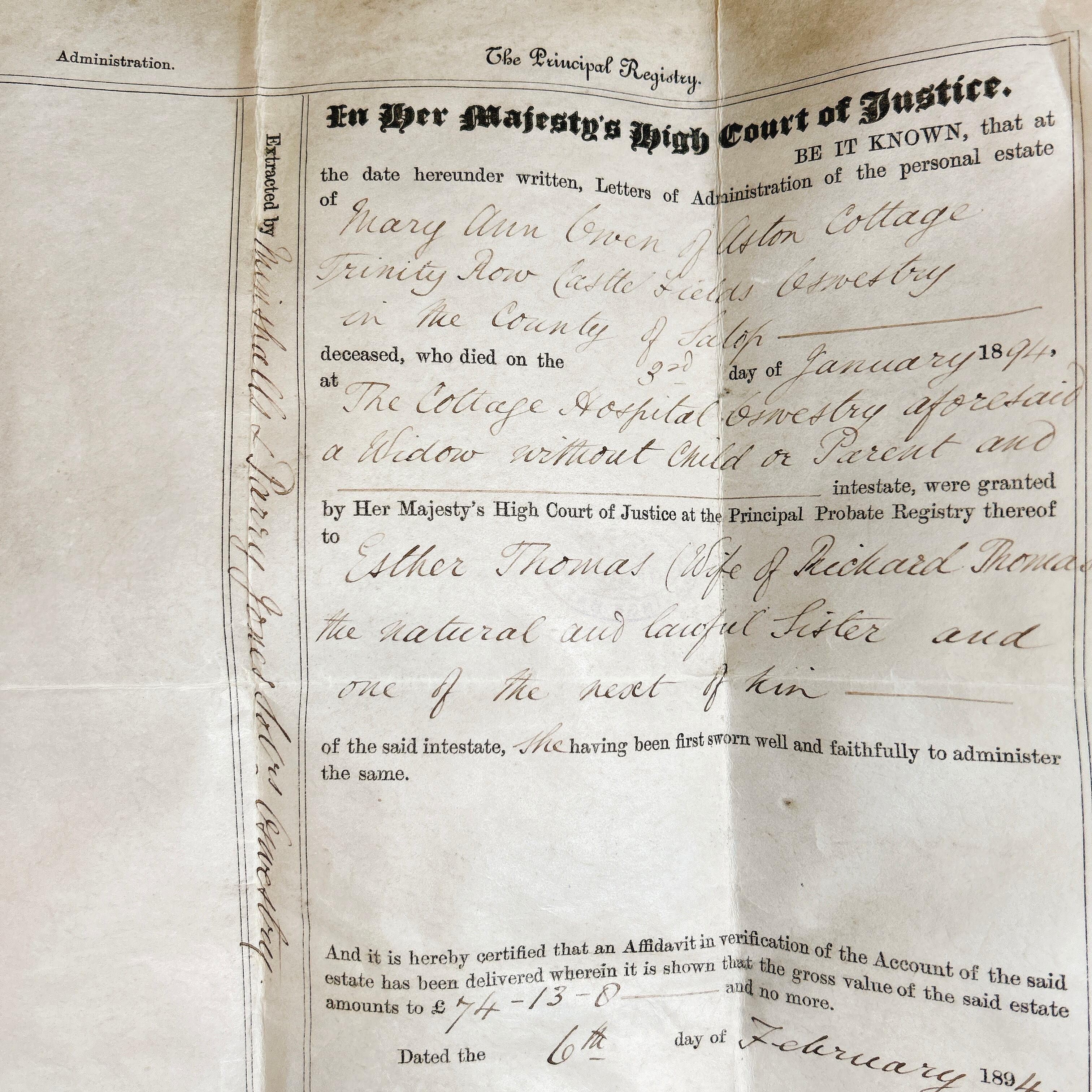 1894年2月6日付で発行された、イギリス・女王陛下高等法院による正式な公文書です。遺産管理権限(Letters of Administration)を示す証書で、Mary Ann Owen の死後、遺産を管理する権利が彼女の実妹 Esther Thomas に与えられたことが記されています。