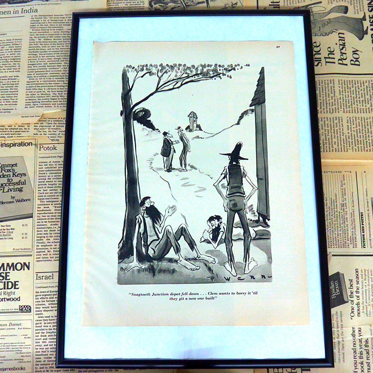 このイラストは、田舎の風景を背景に、無造作に座ったり立ったりしている数人のキャラクターが描かれています。中央には木の下でくつろぐ人物や、遠くで話をしている人物など、それぞれ個性的なポーズや表情が特徴です。キャプションには、田舎の鉄道駅(depot)が壊れてしまい、クレムという人物が新しい駅ができるまでそれを「借りたい」と言っているというユーモラスな会話が記されています。アメリカ南部の方言や田舎的な素朴さを風刺的に表現しており、駅舎が「借り物」になるという発想そのものがナンセンスで面白みを増しています。イラストの線は柔らかく、キャラクターの長閑な雰囲気が伝わってきます。田舎ののんびりとした暮らしや、ユーモアあふれる日常を垣間見ることができる一枚です。