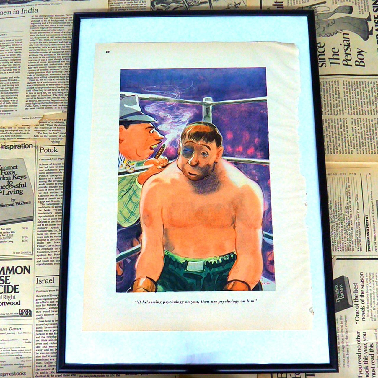 このイラストは、ボクシングの試合に臨む選手とそのセコンドが描かれた風刺的なワンシーンです。セコンドは葉巻をくわえながら必死にアドバイスを送り、リングに座るボクサーは顔に大きなアザを作り、やや呆然とした表情で前を見つめています。キャプションには「もし相手が心理戦を仕掛けてきたら、お前も心理戦で返せ」という意味合いのセリフが添えられており、困惑したボクサーの表情との対比がユーモラスです。このイラストは、試合中の駆け引きや心理戦の複雑さをコミカルに描写し、見る人に思わず微笑みを誘います。1970年代の雑誌ならではの生き生きとした筆致と色彩も魅力で、当時のアメリカンユーモア、そしてスポーツ漫画の雰囲気を存分に味わうことができる一枚です。