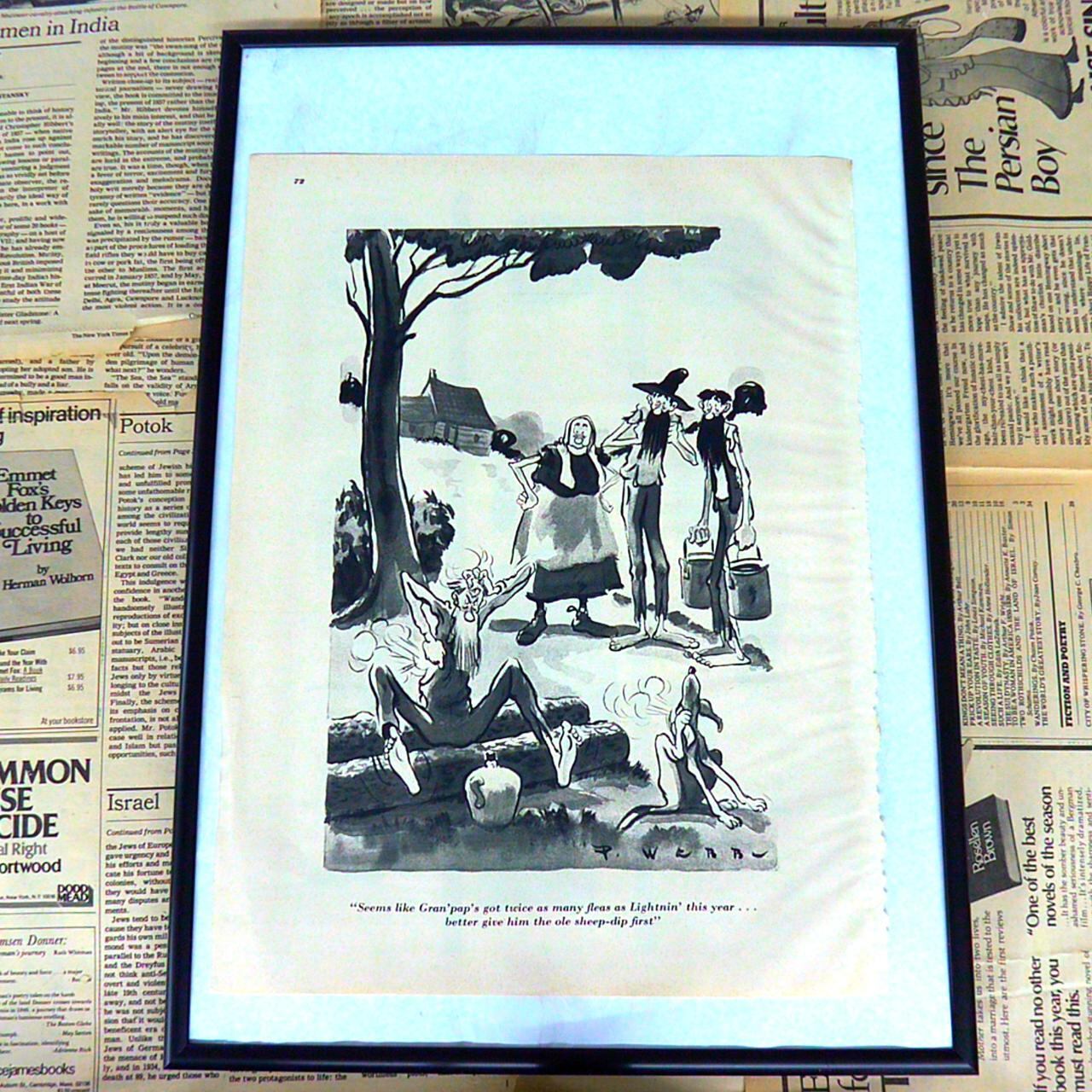 このイラストは、ユーモラスなカントリーライフを描いた風刺画です。場面は田舎の家の前で、木の下に座っている長いヒゲの老人(Gran'pop)が、かゆみに悩まされている様子がコミカルに表現されています。周囲には心配そうに見つめる家族や農民風の人物が立ち、手にはバケツや道具を持っています。キャプションには『Gran'popは今年はLightnin'(多分ペットの名前)よりもノミが二倍もいるみたいだ…まずはおなじみの羊用の殺虫風呂に入れてやった方が良さそうだ』とあり、笑いを誘います。田舎の生活の一場面を誇張して描き、登場人物の表情や動きが生き生きとしているのが特徴です。ノスタルジックでユーモラスな雰囲気が、当時のアメリカンコミックらしい親しみやすさを感じさせます。