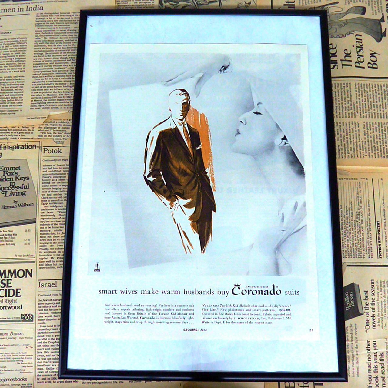 Coronadoは、主に高品質な紳士用スーツやアパレルを展開するブランドです。特に時代の流行を取り入れつつ、クラシックなスタイルと上質な素材選びにこだわった商品を提供しています。創業以来、洗練されたデザインと着心地の良さから、多くのビジネスマンやファッショニスタに支持されています。この広告が掲載された当時も、機能性とエレガンスを両立したスーツを打ち出し、都会的な男性像を提案していました。Coronadoのスーツは、日常からフォーマルまで幅広いシーンで活躍し、着る人の自信と魅力を引き出す一着として人気を博しています。