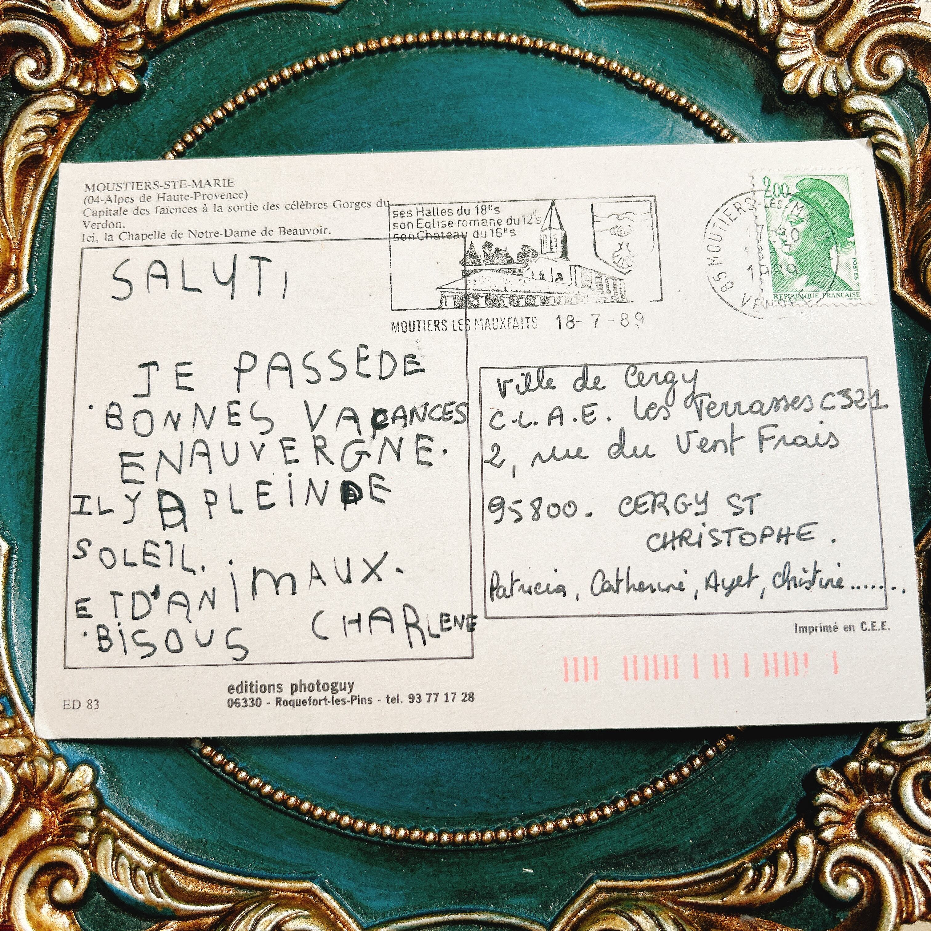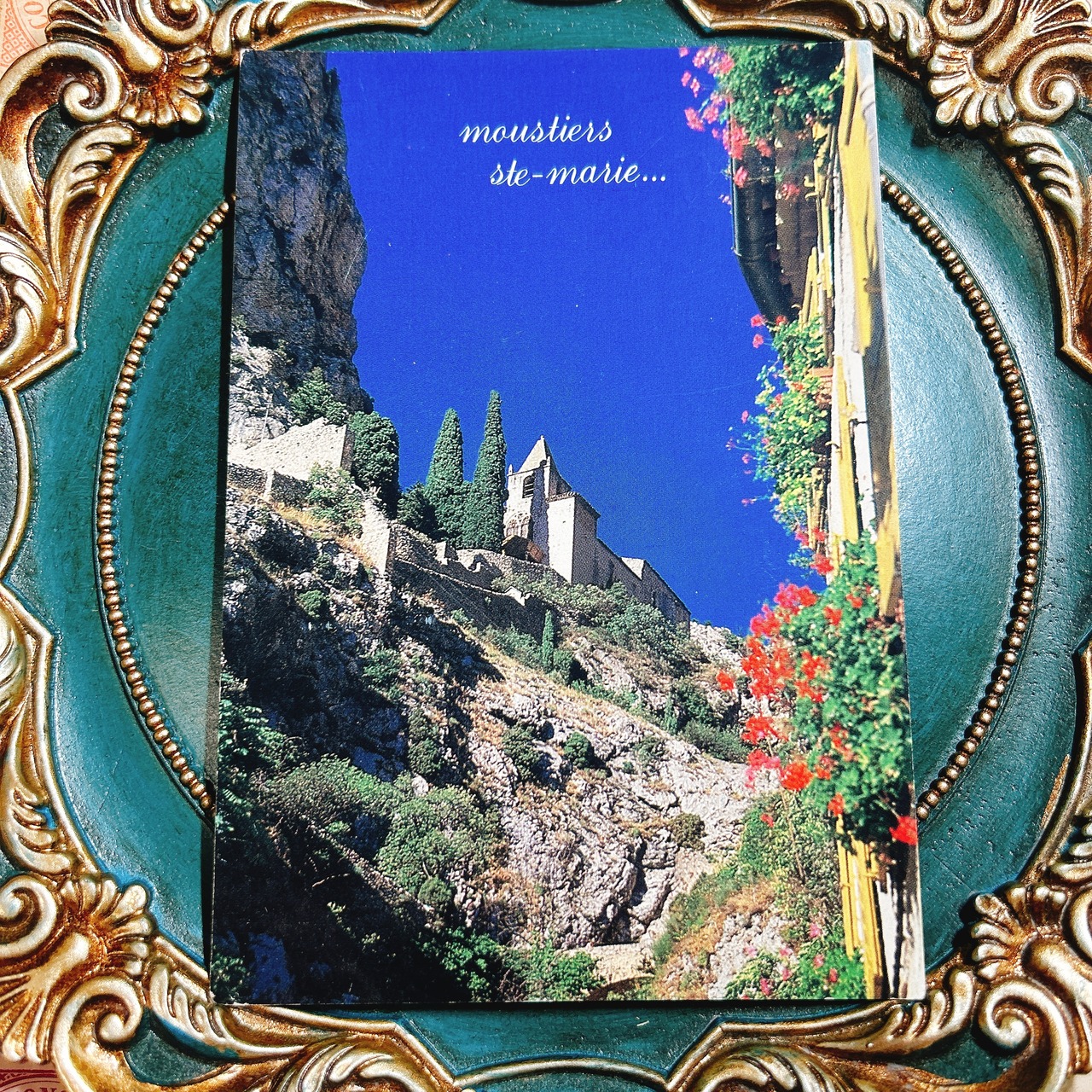 フランスの美しい村として名高いムスティエ=サント=マリーの景観を写したヴィンテージポストカードです。表面には、切り立った岩山の中腹に佇む小さな教会と、石積みの壁、そしてその周囲に茂る緑が鮮やかに写され、右側には色とりどりの花が飾られた建物のバルコニーが映り込んでいます。深い青空とのコントラストが美しく、南仏らしい明るく開放的な空気を感じさせます。裏面には1989年にフランス国内で実際に使用された記録があり、筆跡からは当時の旅情や思い出が生き生きと伝わってきます。郵便スタンプや手書きのメッセージ、住所の記載もそのまま残されており、ノスタルジックな味わいをお楽しみいただける一枚です。経年による軽微な変色はありますが、目立つ破れや汚れはなく、全体的に良好なコンディションを保っています。コラージュ素材やスクラップブック、ディスプレイのアクセントとしてもおすすめです。旅の記憶や古き良きヨーロッパの風景に惹かれる方にぜひ。