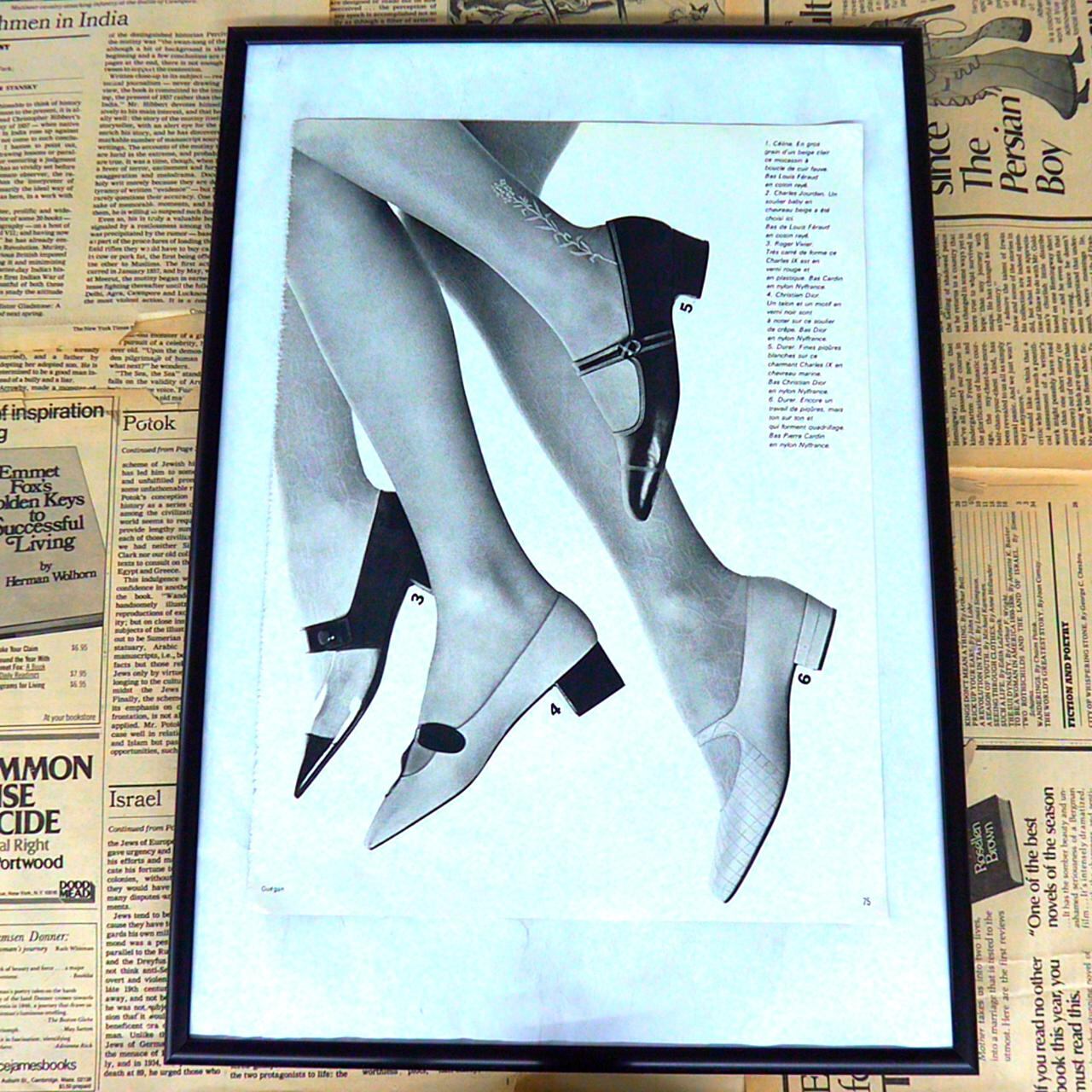 このページには、女性の足元にさまざまなデザインのパンプスが美しく配置されたファッションイラストが描かれています。各シューズには番号が振られており、右上にはブランド名やデザイナー名がリストアップされています。パンプスは1960~70年代らしいポインテッドトゥやベルト付き、金具使いなど、個性的かつエレガントなデザインが特徴です。一つひとつの靴が異なるテイストを持ち、見る者にレトロで洗練された印象を与えます。背景は白でシンプルにまとめられ、靴のシルエットと質感が際立つモノクロ写真イラストとなっています。フレームに入れることで、アートポスターとしてもお部屋の雰囲気をぐっと引き上げてくれるアイテムです。