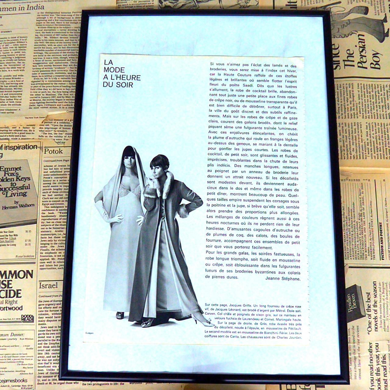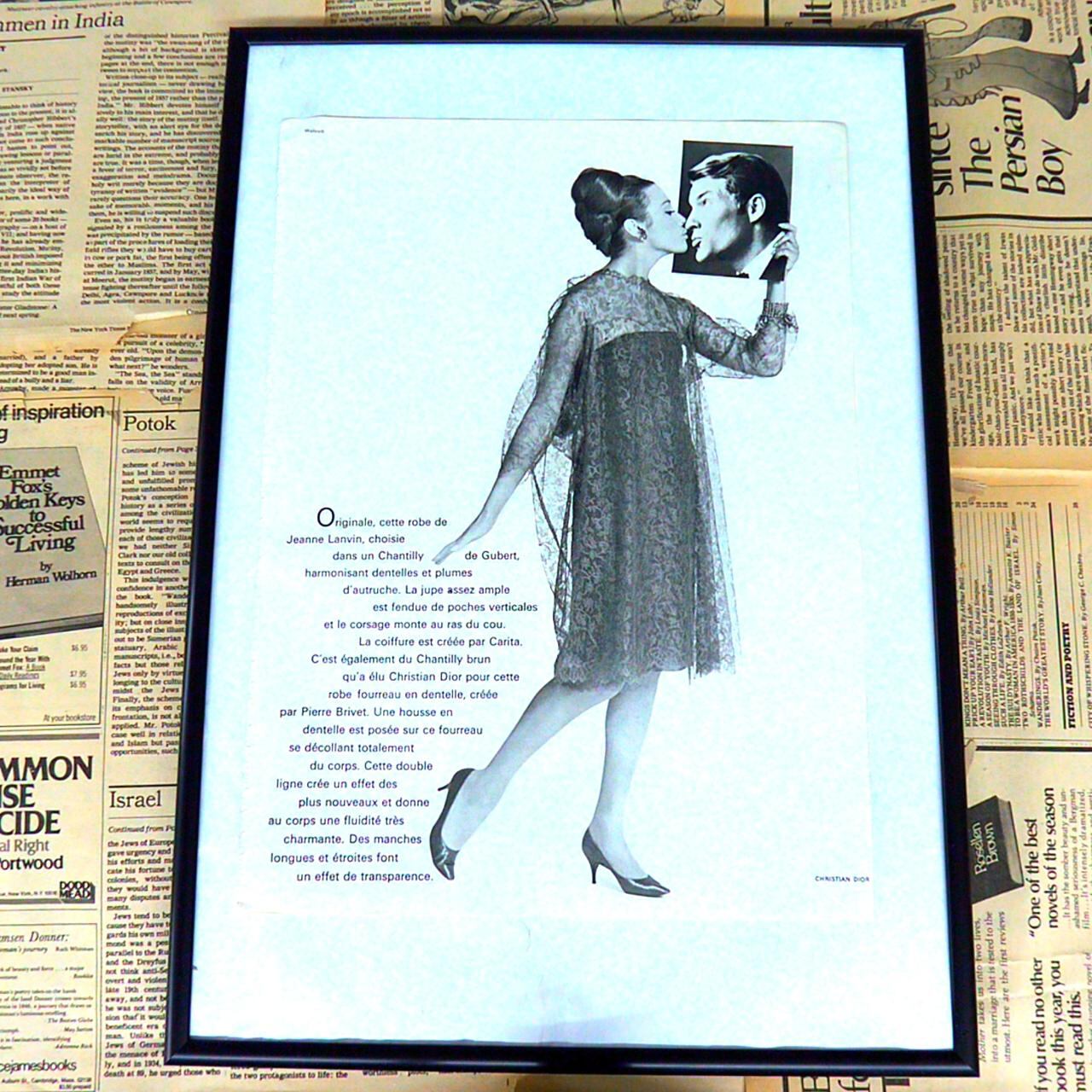 このイラストは、1960年代〜1970年代のファッション雑誌を彷彿とさせる、優雅な女性のドレスを取り上げています。女性は洗練されたチュールのドレスに身を包み、手に男性の顔写真を持ち上げてキスするような独創的なポーズをとっています。ドレスはジャンヌ・ランバンによるもので、シャンティイレースとダチョウの羽を組み合わせたデザインが特徴。さらに、クリスチャン・ディオールのレースドレスについても記載があり、両者ともに細部にこだわり抜いた技術とエレガンスが感じられます。フランス語によるテキストには、ドレスの構造や素材、コーディネートされたヘアスタイル(カリタによる)までが詳細に記されており、シースルー効果や透明感も強調。イラスト全体からは、当時のモード界が追求した女性美と芸術性、そして洗練された遊び心が存分に伝わってきます。