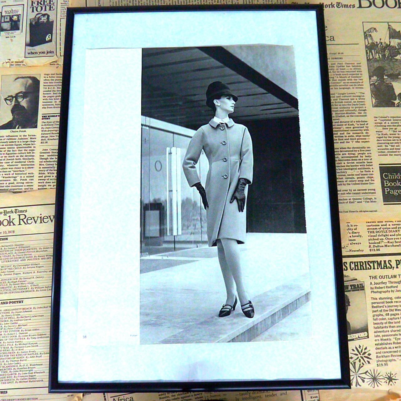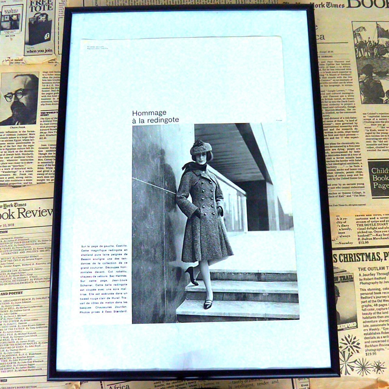 このフレーム内の紙面は、ファッション写真を中心としたイラストページです。白黒の写真には、クラシックな雰囲気のコートと帽子を身に着けた女性が階段に立つ様子が美しく切り取られています。『Hommage à la redingote(レディンゴートへのオマージュ)』というタイトルの通り、19世紀の乗馬服からインスパイアされたファッションが現代的にアレンジされています。キャプションには、モデルの着用している上質なレディンゴートコートやその素材、デザインの魅力が紹介されています。背景にはモダンな建築が静かに広がり、クラシカルとモダンのコントラストが際立つ構図です。女性の姿勢や表情には上品さと知性が感じられ、当時の女性らしいエレガンスを象徴しています。インテリアとしても映える、ヴィンテージファッションの美しさを伝える一枚です。