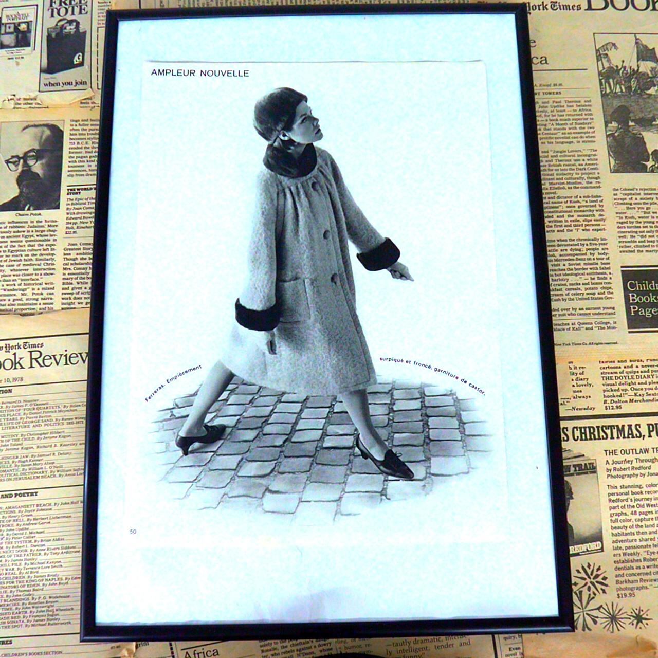 このイラストは、石畳の上を大きなコートを羽織って颯爽と歩く女性を描いています。タイトルの『AMPLEUR NOUVELLE』(フランス語で「新しいボリューム」の意)が示すように、体を包み込むようなふんわりとしたコートのボリューム感が際立っています。コートには大きなボタンと、袖口や襟に黒いファーがあしらわれており、高級感や冬の暖かさが表現されています。モデルは横向きに大股で歩いており、斬新で現代的な女性像を感じさせます。背景はシンプルな石畳のみで、ファッションアイテムそのもののシルエットや質感を際立たせています。キャプション部分には仏語で細部の説明が添えられ、フランス発のファッション雑誌やカタログの一ページであることがうかがえます。クラシックでエレガント、かつ力強さも感じさせる素敵なイラストレーションです。