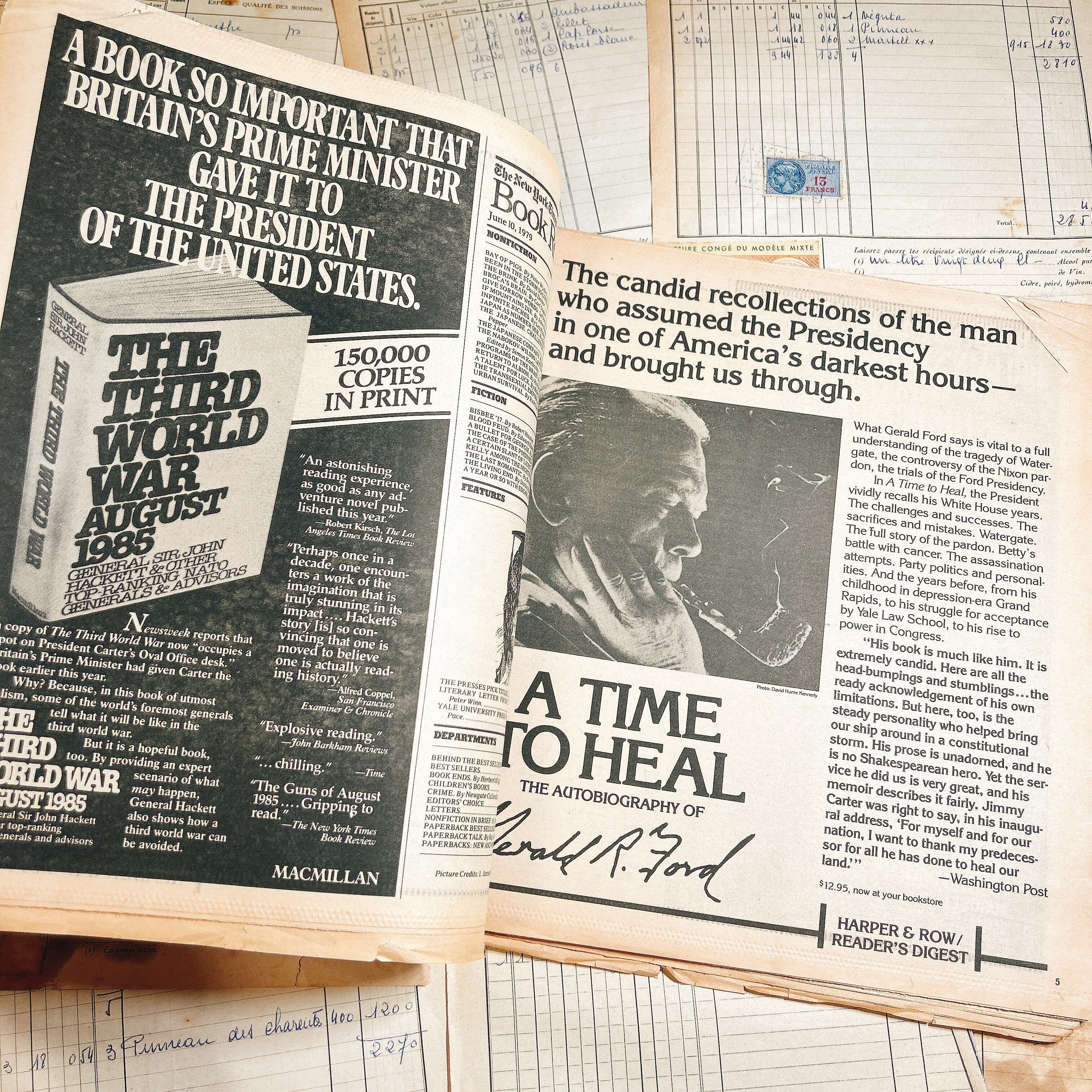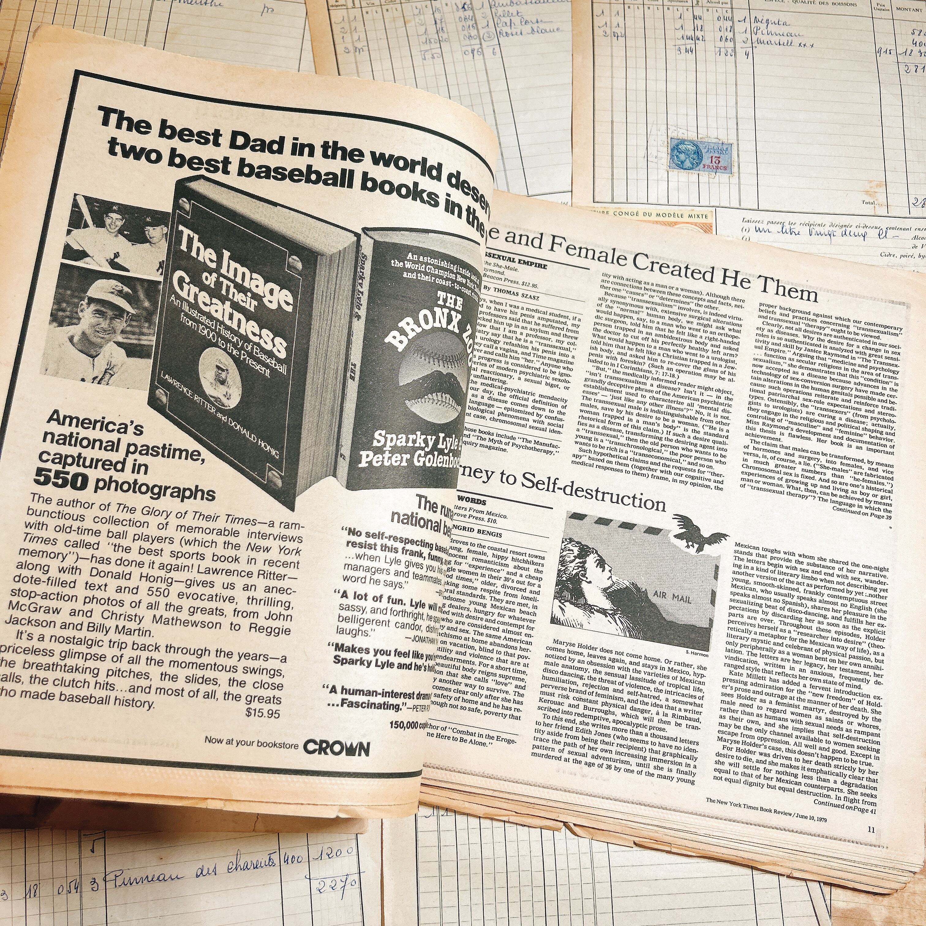 こちらは1980年代『The New York Times Book Review』のヴィンテージ新聞1冊です。ニューヨーク・タイムズが毎週日曜日に発行しているブックレビュー専門の別冊紙で、文学やノンフィクションを中心にした評論や特集が豊富に掲載されています。1980年当時の知的文化を色濃く反映した内容が紙面を彩ります。