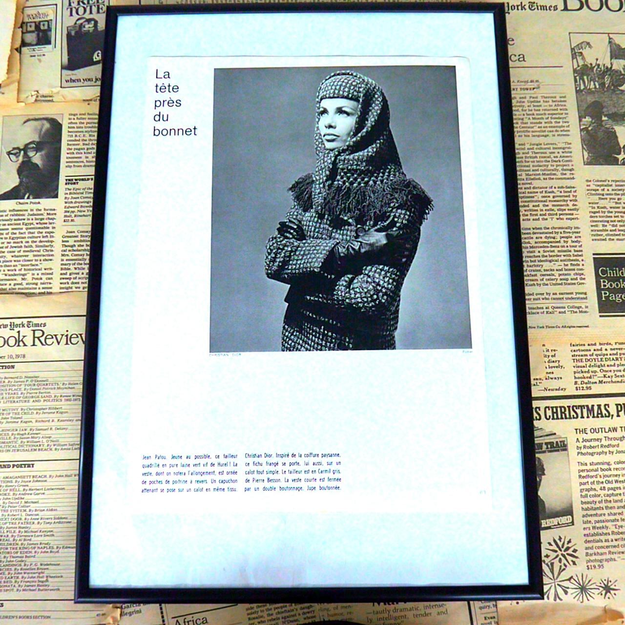 このイラストページは、1970年代のファッション誌ならではのモノクロ写真を用いたファッション特集の一部です。『La tête près du bonnet』(直訳すると「ボンネットに近い頭」)というキャプションが左上にあり、中央にはフリンジ付きのフードとコーディネートされた個性的なニットを身にまとうモデルが印象的に写し出されています。写真は当時のハイファッションの独自性と斬新なデザイン性を際立たせており、その服装はフランスの著名なクチュリエやブランド(例:Christian Diorなど)の影響を感じさせます。本文には帽子や衣装の素材、デザインのインスピレーションについて簡潔に記載されており、モデルの静かな強さとモダンな雰囲気が伝わります。全体的に静謐で芸術性の高い写真が、インテリアとしても美しい存在感を放ち、当時の最先端ファッションの空気を今に伝えています。