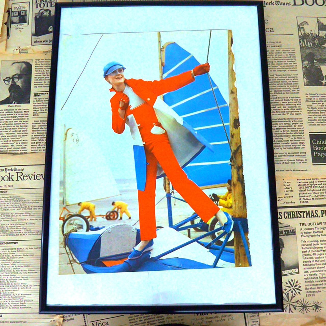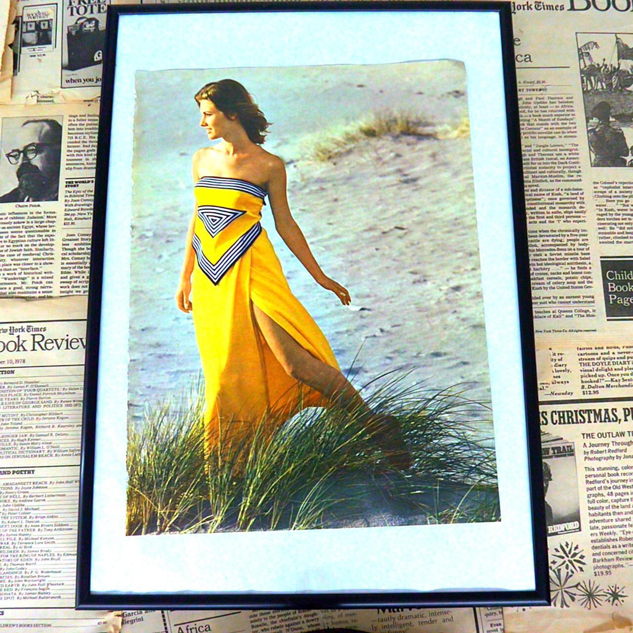 このフレーム内の紙面は、1970年代のファッション誌の1ページと推測され、鮮やかな黄色のドレスをまとった女性が砂丘の草原の中を歩く姿が印象的に描かれています。ドレスはストラップレスで、胸元には幾何学模様のデザインがあしらわれ、シンプルながらも大胆なカッティングと色使いが特徴的です。モデルの視線や自然なポージングからは、当時の自由な空気感やリラックスしたムードが伝わってきます。背景には柔らかな砂と風に揺れる草が広がり、構図全体がナチュラルな美しさを際立たせています。イラストというよりは写真ですが、ファッションページとしてアート性が高く、インテリアとして飾るのにも適した一枚です。70年代のカラーやデザインの魅力が詰まった、当時のモードを感じさせるヴィンテージな雰囲気をお楽しみください。