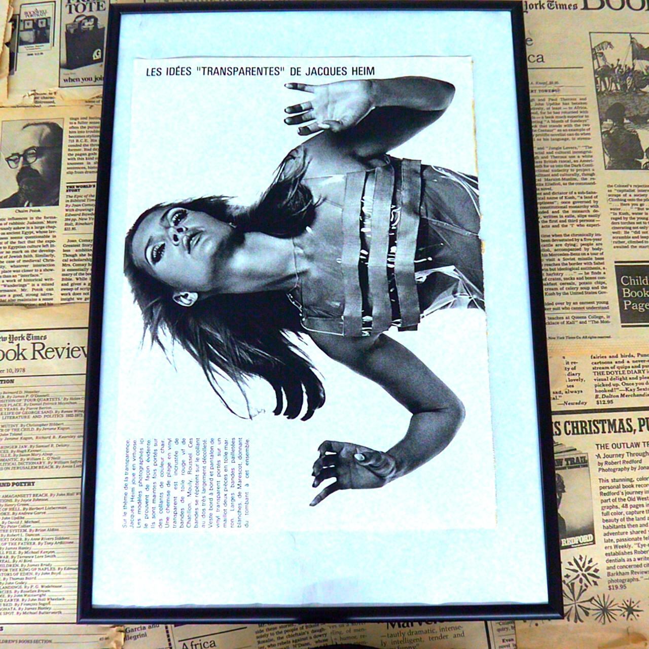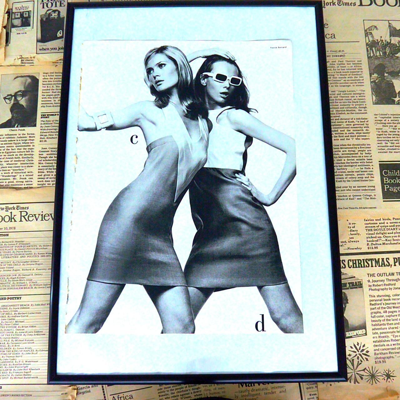 この紙面は、1970年代の雑誌に掲載されたファッションイラストです。大胆なポージングの2人の女性が、斬新なデザインのドレスに身を包んで並び、そのスタイリッシュな姿が白黒で印象的に描かれています。それぞれのモデルには「c」と「d」のアルファベットが添えられており、おそらくカタログや特集ページの一部として、複数のファッションアイテムが紹介されていたのでしょう。左の女性は腕に特徴的なアクセサリーをつけて堂々と前を見る姿、右の女性はサングラスをかけてクールな表情を見せ、ファッションの多様性や個性を強調しています。背景や余計な要素はなく、服とモデルの魅力が最大限に引き立つ、グラフィカルで洗練されたイラストレーションです。1970年代特有の自由で先鋭的なモードファッションの雰囲気を感じさせ、お部屋のインテリアとしてもヴィンテージ感を演出してくれる一枚です。