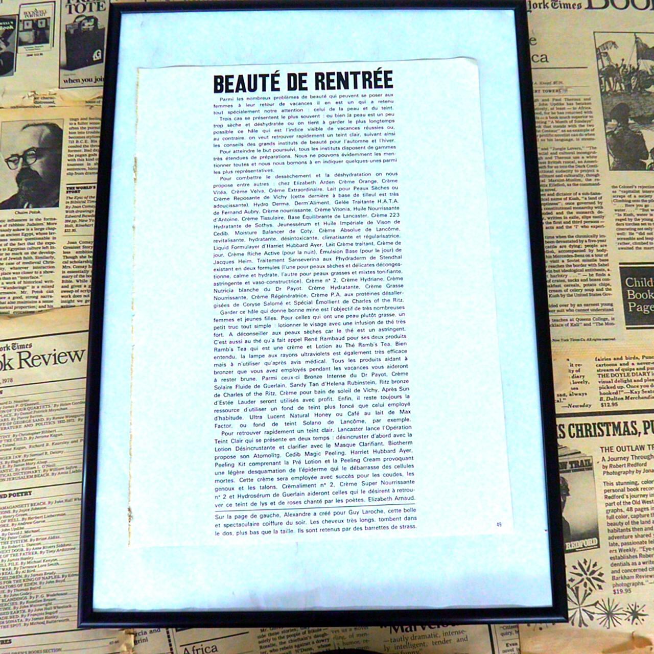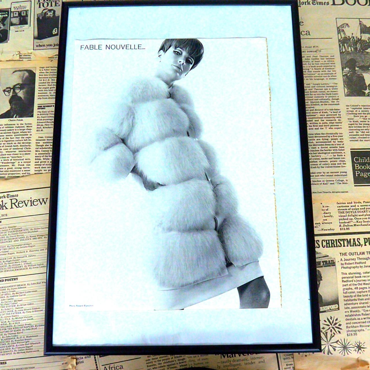 この紙面は、モノクロ写真によるファッションイラストレーションです。中央には、大きなファーコートを身にまとった女性モデルが立ち、強い目線をこちらに向けています。コートのボリューム感や質感が印象的で、1970年代のラグジュアリーかつモダンなファッションの象徴とも言える一枚です。タイトルとして『FABLE NOUVELLE...』と記されており、これはフランス語で『新しい物語』という意味。まるで物語の中の登場人物のような幻想的な雰囲気を醸し出しています。写真の撮影には細部までこだわりが感じられ、ファッションの最先端を表現しつつ、時代を超えた美しさを伝える作品です。華やかで洗練されたデザインは、インテリアアートとしてもおすすめできる一枚です。