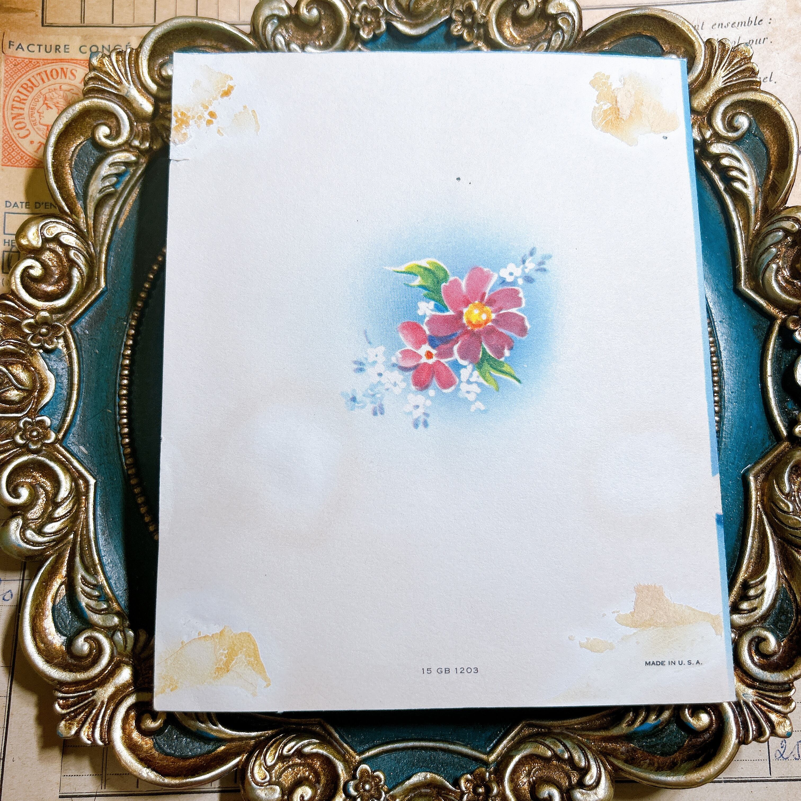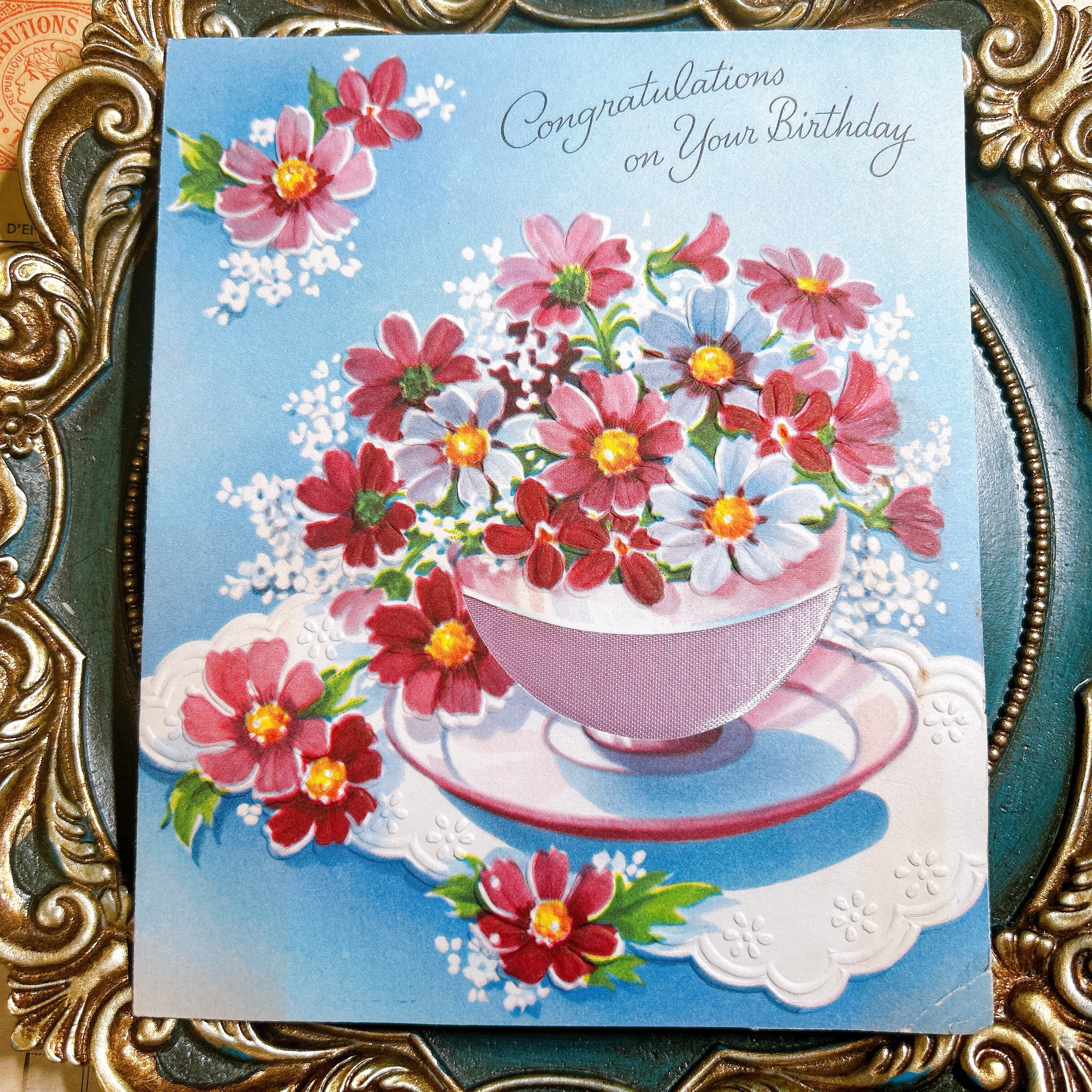 こちらはアメリカ製のビンテージバースデーカードで、ティーカップに飾られた華やかな赤や白の小花があしらわれた美しいデザインです。青い背景に映える花々が立体的に描かれ、上部には「Congratulations on Your Birthday」とエレガントな筆記体でメッセージが添えられています。繊細なレース模様を思わせる白い縁取りも施され、上品で祝福感にあふれる一枚です。