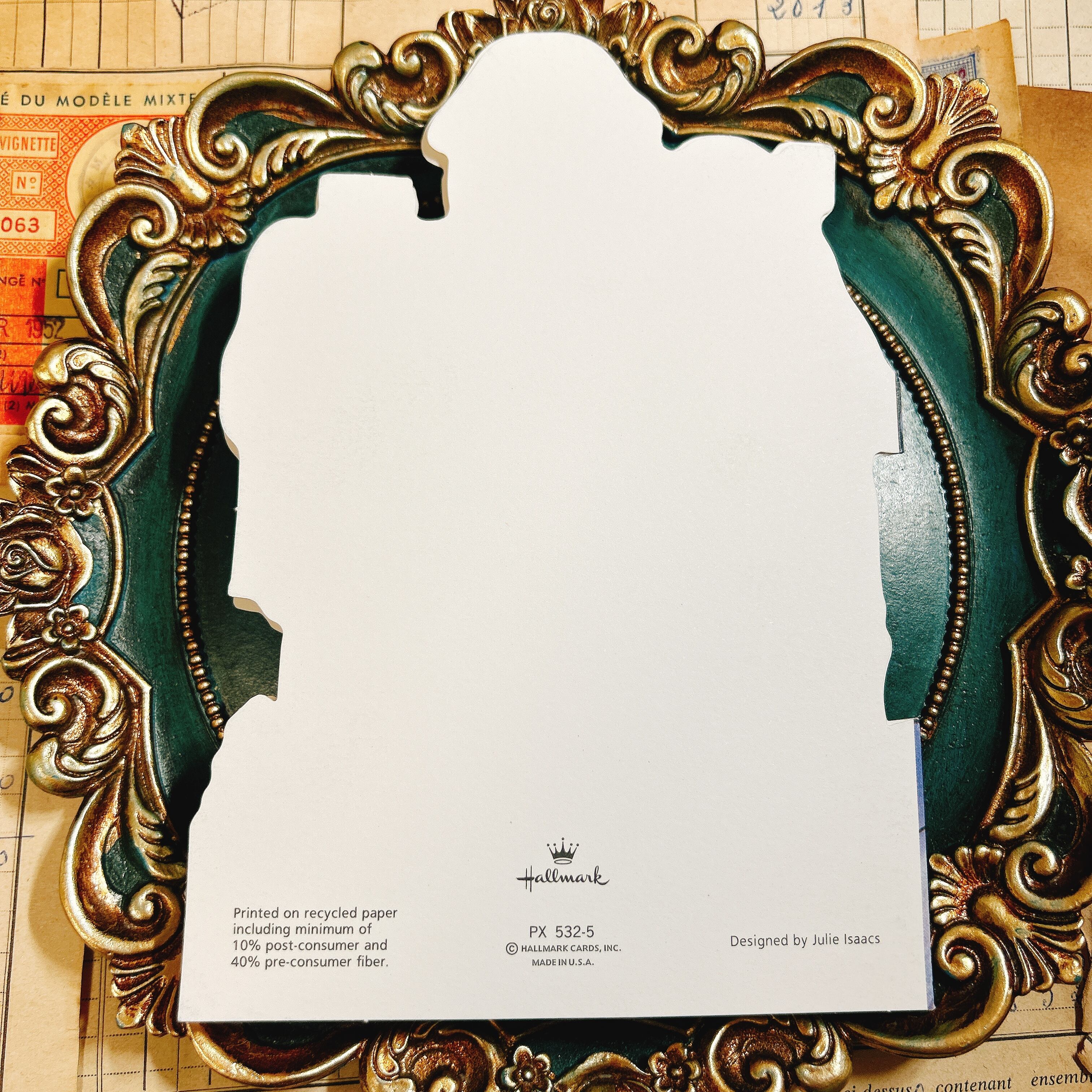 カードを開くと「Joy to your world!」というシンプルで力強いメッセージが青い文字で印字されており、贈る相手に喜びと祝福を届けることができます。内側は余白も多く、自分の言葉で心のこもったメッセージを書き添えることも可能です。裏面にはHallmark社のロゴがあり、Julie Isaacsによるデザインであることが記されています。さらにリサイクル紙を使用して製造されており、環境にも配慮された一品です。