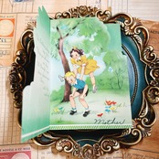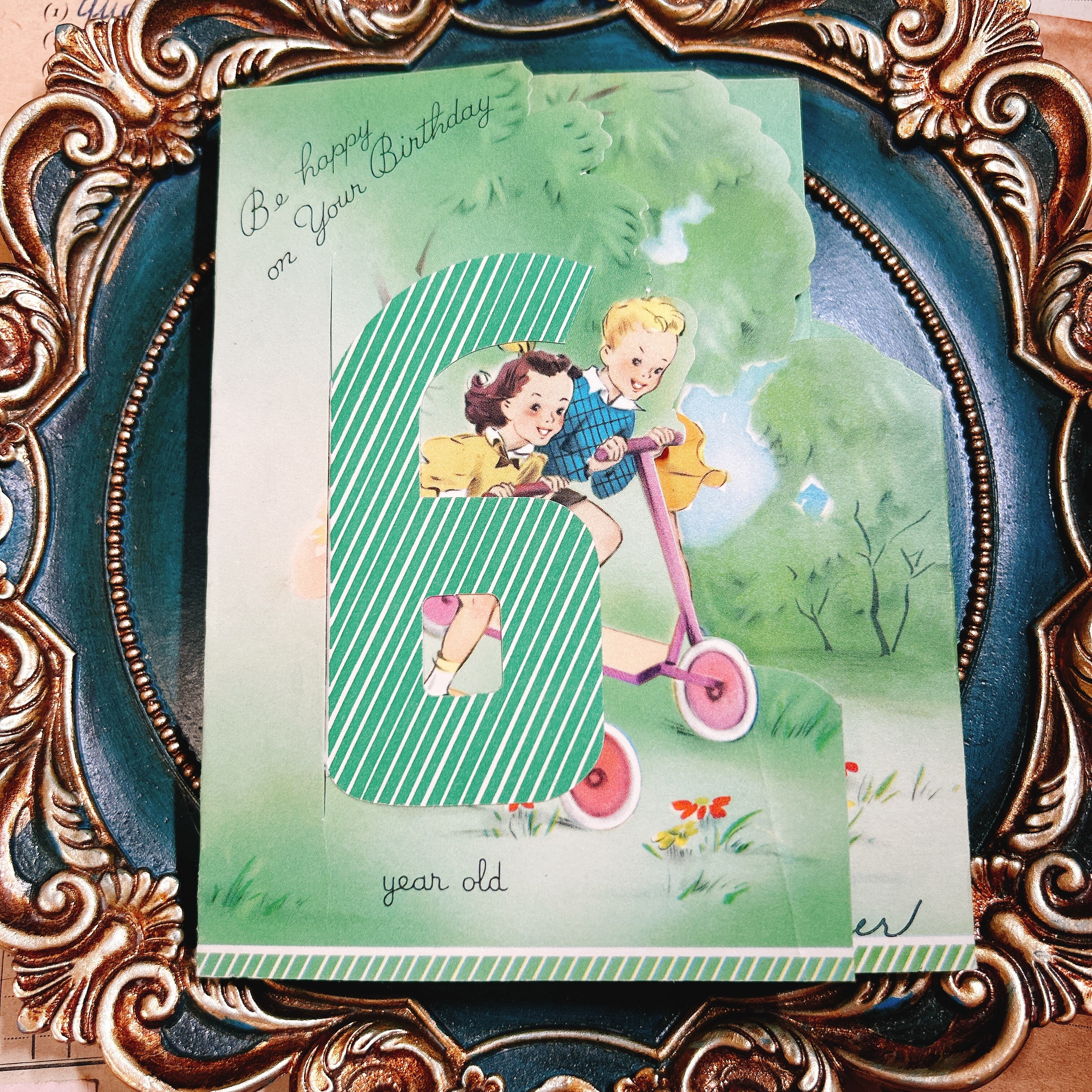 こちらは、6歳の誕生日を祝うために作られたヴィンテージバースデーカードです。表紙には大きな緑色のストライプ柄の「6」の数字が大胆にデザインされ、その中から仲良くスクーターに乗る子供たちの微笑ましいイラストが覗きます。鮮やかなグリーンを基調としたデザインは爽やかで、元気いっぱいな6歳の子供にぴったりの雰囲気を持っています。