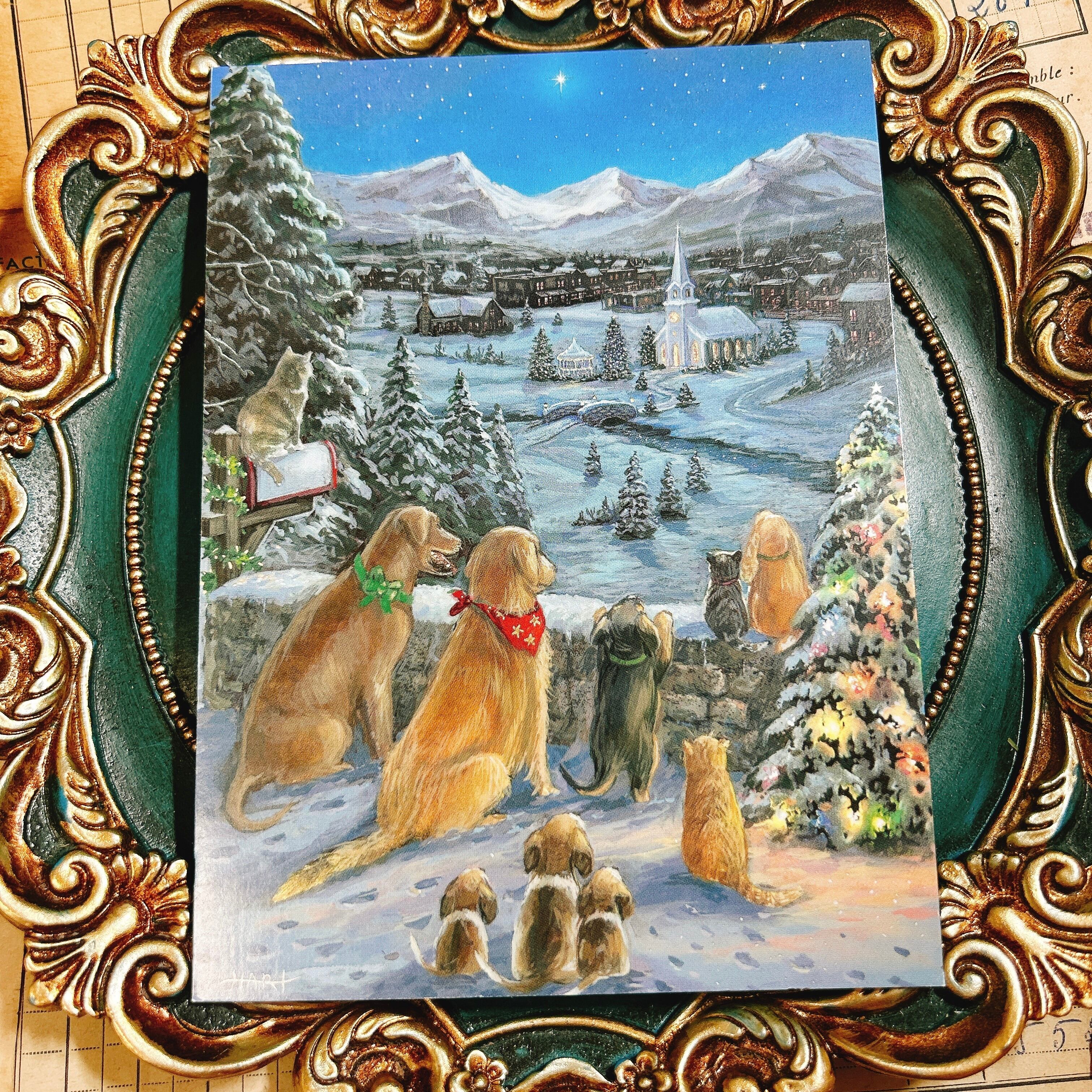 こちらは、雪景色を背景に描かれたクリスマスカードです。表面には、石垣の前に並ぶ犬や猫たちの後ろ姿が描かれ、彼らが町の広場や教会の輝きを見つめる温かいシーンが広がっています。背景には雪化粧をまとった山々と、星が瞬く澄んだ夜空が描かれ、まるで絵本の1ページのような幻想的な雰囲気を漂わせています。犬たちが首に巻いた赤や緑のリボンが、クリスマスらしい彩りを添えています。
