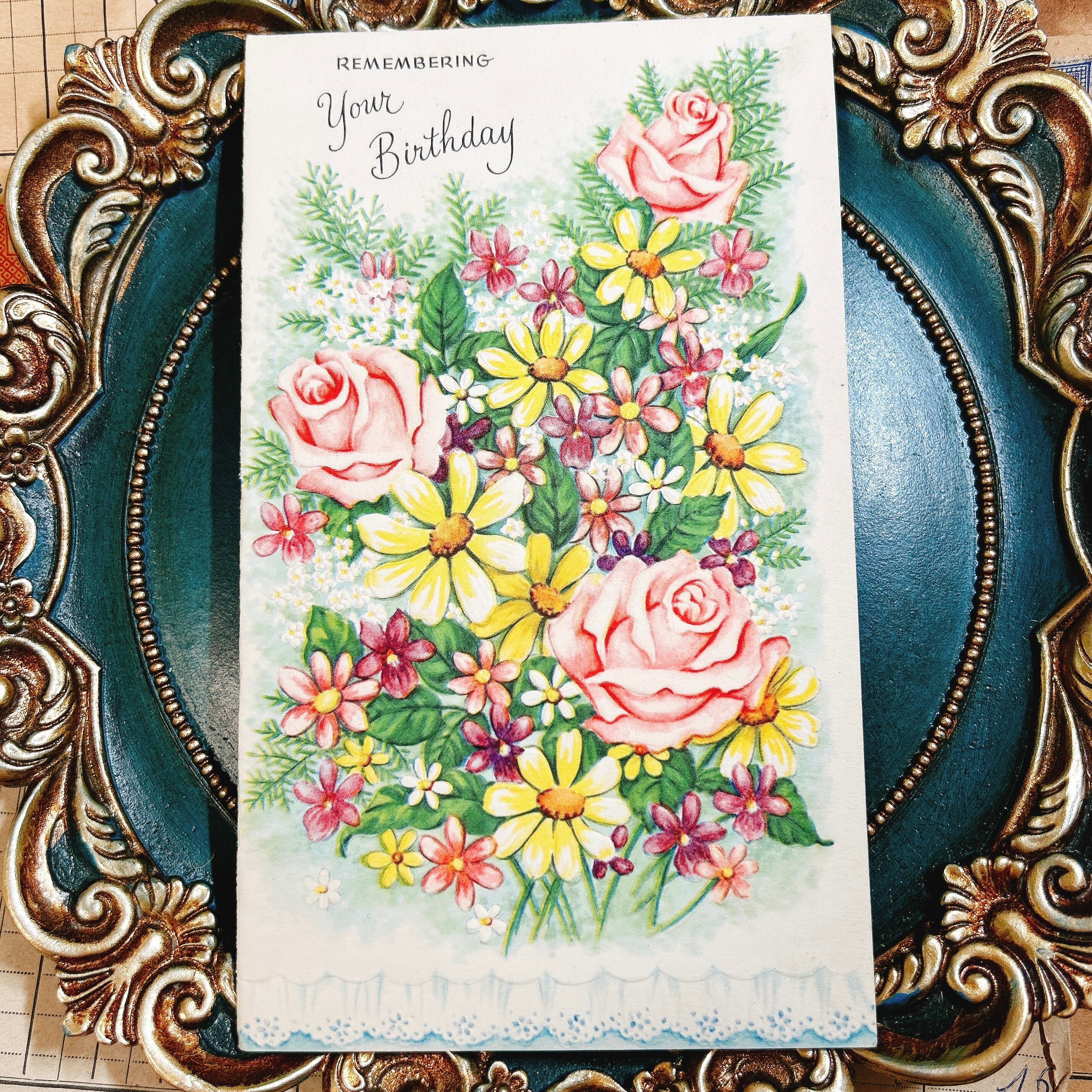 こちらは繊細な花柄が美しいヴィンテージバースデーカードです。表紙には淡いブルーを背景に、ピンクのバラを中心としたカラフルな花束が描かれています。細やかな筆致で描かれた花々は華やかでありながら落ち着いた雰囲気を持ち、特別な日の贈り物にふさわしい一枚です。上部には「Remembering Your Birthday」と書かれ、心のこもった祝福の気持ちを伝えています。