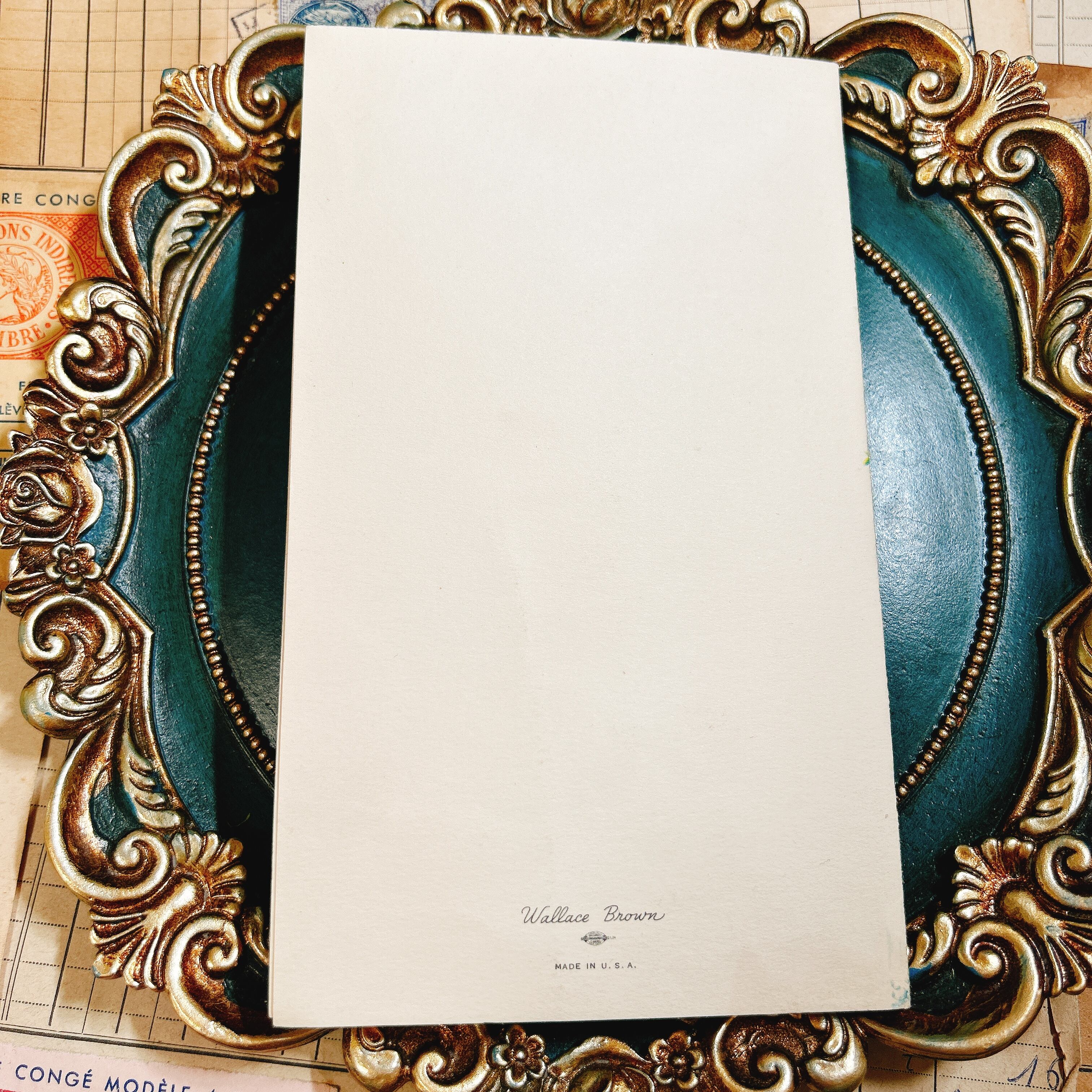 裏面には「Wallace Brown」の印字があり、アメリカ製であることが示されています。全体的に保存状態は良好で、経年による自然な風合いがヴィンテージらしい魅力を引き立てています。華やかな花束のデザインと優しい言葉が調和した、時代を超えて心を温める一品です。コレクションやディスプレイにはもちろん、アンティークの温もりを感じるインテリア小物としてもおすすめです。