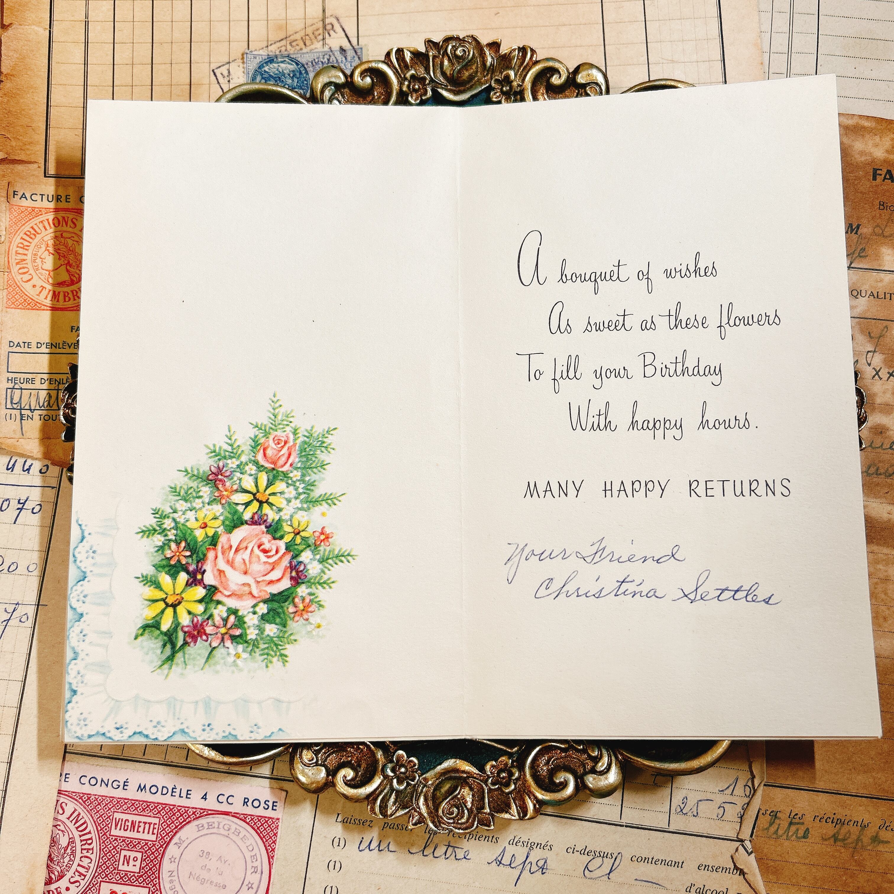 カードを開くと、左側に花束の小さな挿絵が施され、右側には「A bouquet of wishes As sweet as these flowers To fill your Birthday With happy hours. MANY HAPPY RETURNS」との温かなメッセージが印字されています。さらに直筆で「Your friend Christina Settles」との署名があり、当時の送り主の思いを感じ取ることができます。