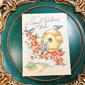 こちらは1942年発行、Rust Craft社製のバースデーカードです。表紙には「A Special Birthday Wish」の文字と、黄色い鳥小屋を囲むように描かれた赤い花と青い小鳥たちのイラストが配され、温かな雰囲気を感じさせます。花々に集う鳥たちの姿は、生命力や祝福の象徴として誕生日を彩るにふさわしいデザインとなっています。カードの表面には手書きで「1942」と記され、当時の空気感をそのまま伝えています。