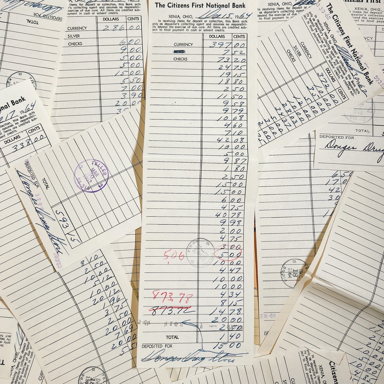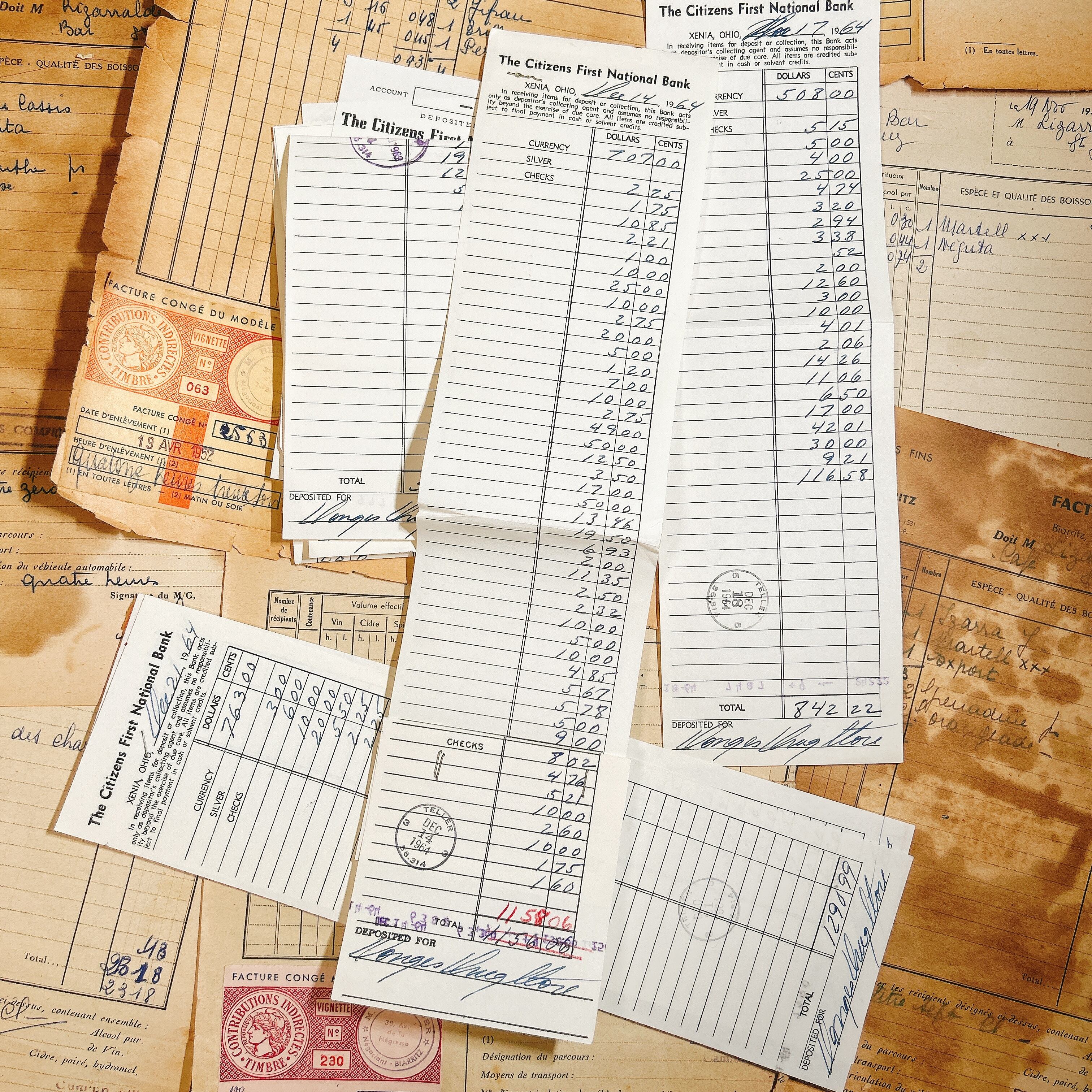 アメリカ・オハイオ州にある「The Citizens First National Bank」の入金伝票がまとまった20グラムセットです。画像に見られるように、1960年代のものを中心に使用済みの記録で、青インクで丁寧に数字や署名が書き込まれています。スタンプも押されており、当時の銀行業務の空気を感じられる資料的価値の高いアイテムです。