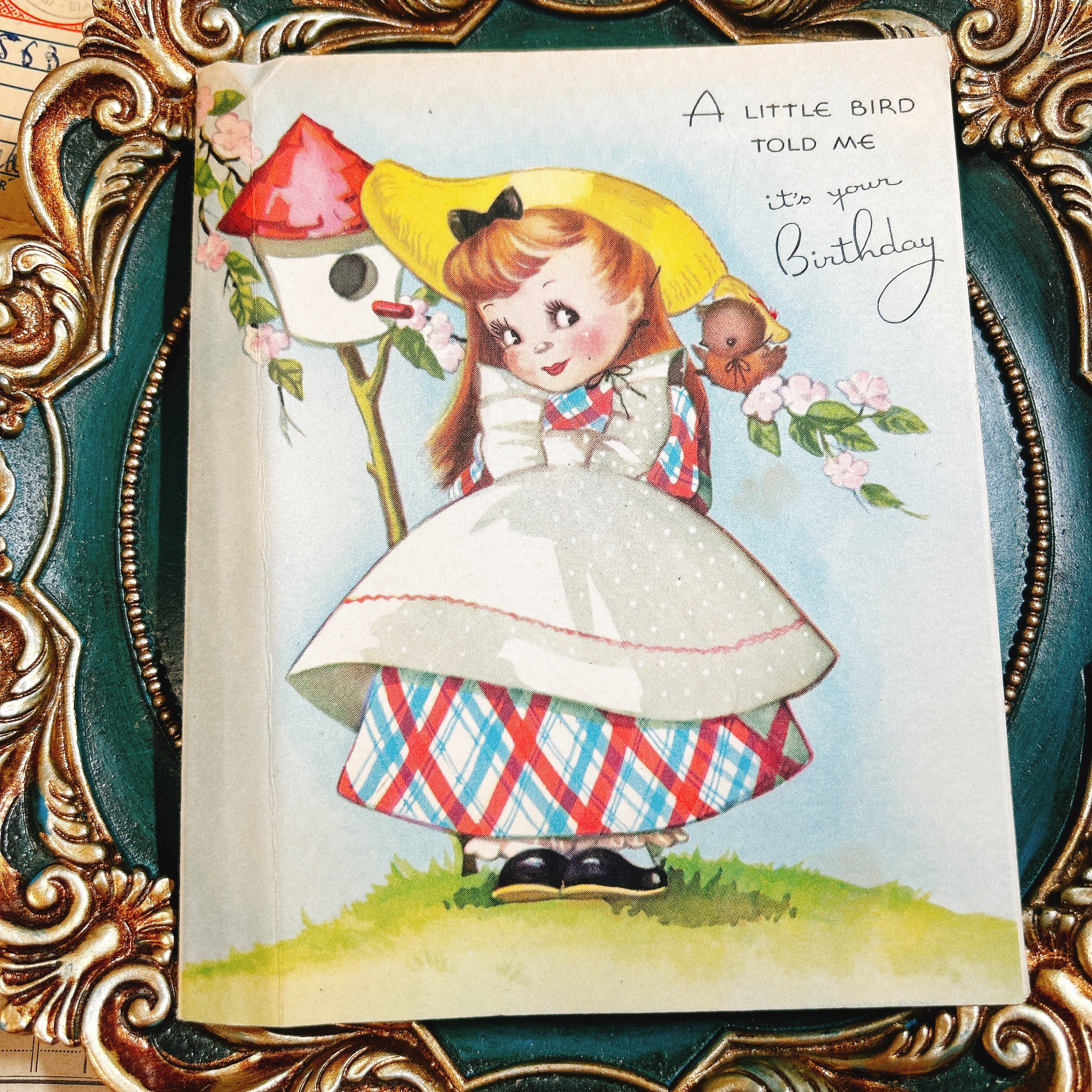 可愛らしい少女と小鳥が描かれたバースデーカードです。表紙には黄色い帽子をかぶった少女が、赤い屋根の巣箱と小鳥と共に立つ様子が愛らしく表現されています。カラフルなチェック柄のドレスと白いエプロンが印象的で、背景には淡い空色が広がり、全体に温かみのある雰囲気を醸し出しています。右上には「A LITTLE BIRD TOLD ME it’s your Birthday」と手書き風の文字が添えられています。