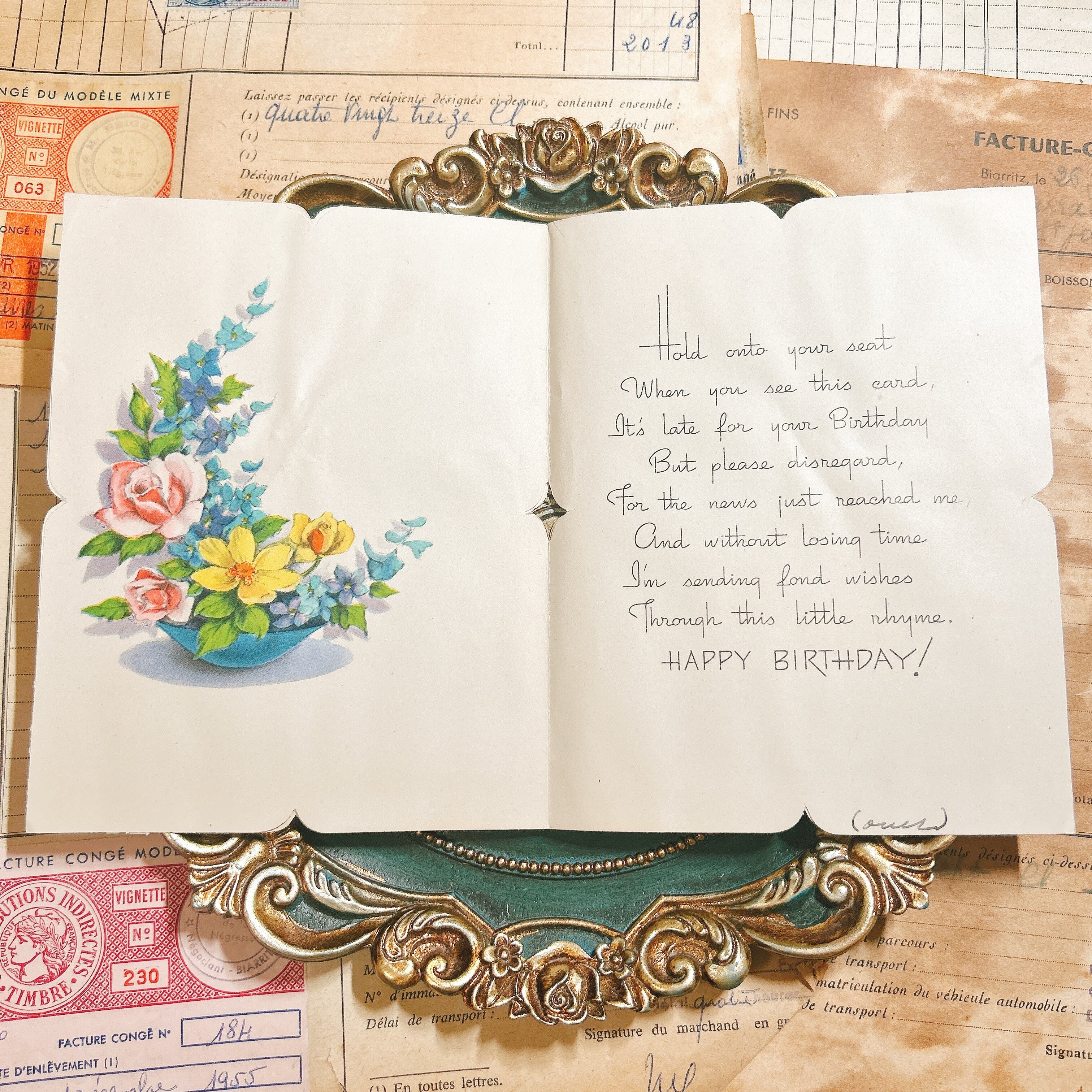 中面にはカラフルな花瓶の花とともに、ユーモアを交えた遅れのお詫びと心からの誕生日の祝福のメッセージが印刷されています。詩のようなリズムで綴られた言葉は、遅れても温かい気持ちを届けようとする工夫が感じられます。また、裏面には「Dearest」と始まる直筆のメッセージが残されており、贈り主の個人的な想いが込められた一点物です。紙面には経年によるシミや擦れが見られますが、それもまたヴィンテージ特有の風合いを感じさせます。