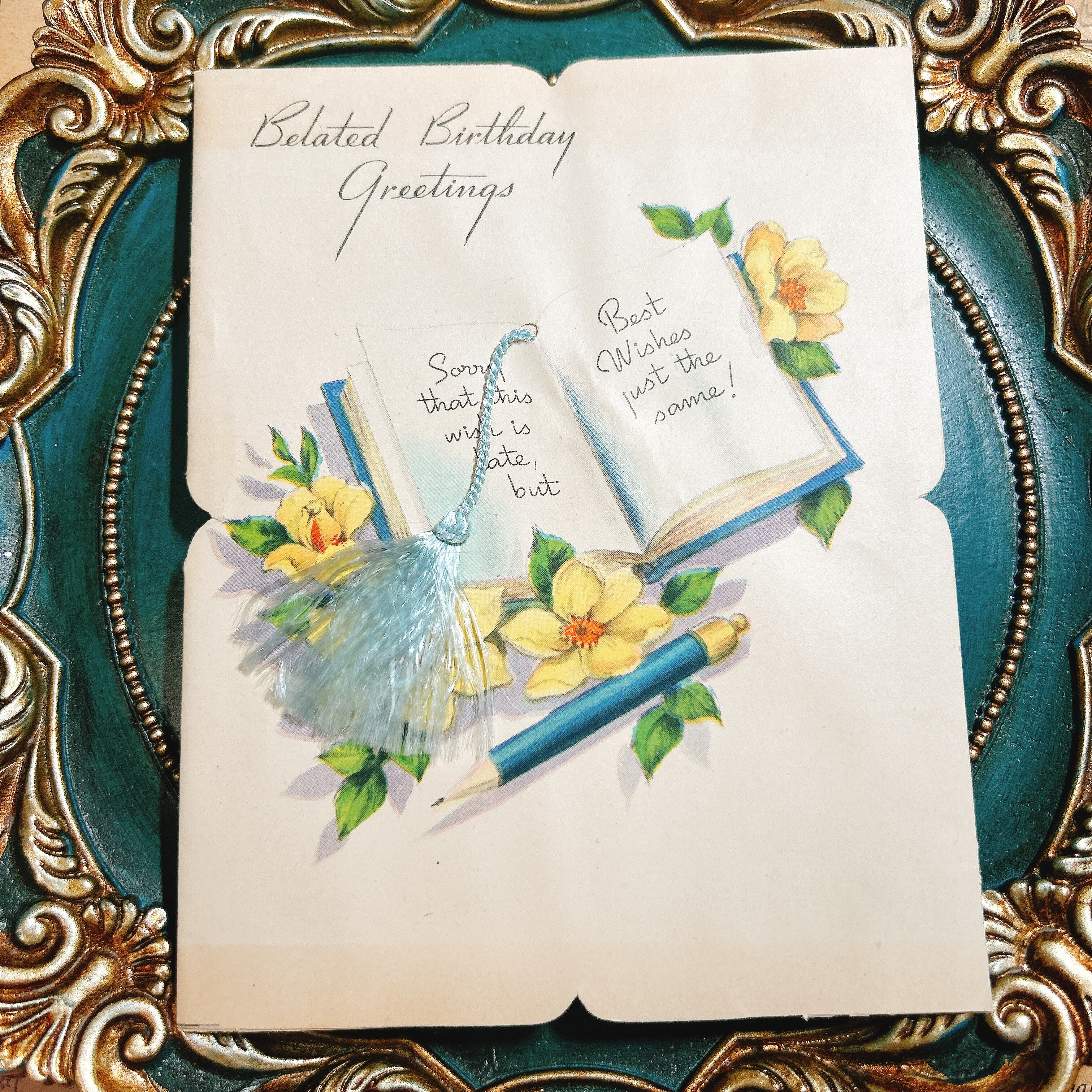こちらは遅れてしまった誕生日を祝うために贈られたヴィンテージのバースデーカードです。表紙には黄色の花とブルーのタッセルが立体的にあしらわれ、開かれた本とペンのイラストが描かれています。本のページには「Sorry that this wish is late, but」「Best Wishes just the same!」と記され、遅れても変わらない祝福の気持ちが伝わるデザインになっています。タッセルが付いた装飾は特別感を演出し、当時のカードらしい繊細な仕上がりです。