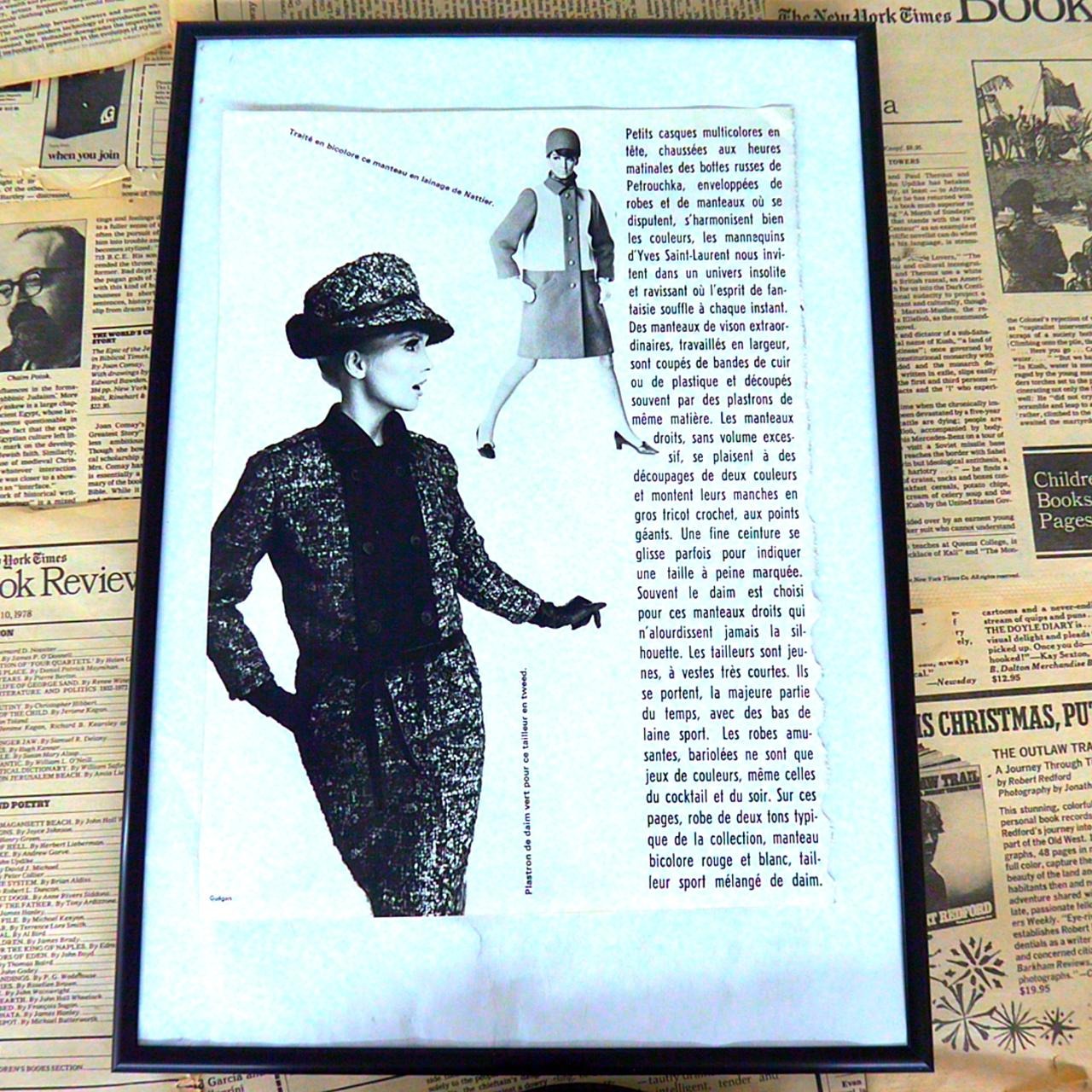 この紙面は1970年代のファッション雑誌の1ページであり、イラストというよりもファッションフォトグラフに近いスタイリッシュなレイアウトです。フランス語で記載された解説文は、今季の女性向けファッションコレクションの特徴やディテールについて述べており、写真には洗練されたスーツスタイルの女性が二人描かれています。両者ともにシックなツーピーススタイルで、一人は襟元に大きなファーマフラーを巻いたAラインのコートを、もう一人はシンプルながらもモダンなジャケットとスカートのセットアップを着用しています。足元はパンプスで揃えられ、全体のシルエットは1960年代後半から70年代初頭のモード感を強調。キャプションでは「ウールのダブル生地を使ったスーツ」とあり、素材感にもこだわりが見られます。フォーマルとカジュアルの絶妙なバランス、そして都会的で洗練された女性像を表現した、当時のモード界の空気感を伝える1枚です。