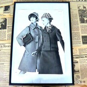 このイラストは1970年代のファッション誌に掲載されたもので、二人の女性がスタイリッシュなコートを身にまとい、季節感のある帽子やバッグを合わせている様子が描かれています。一人はシンプルなコートスタイルにキルティングバッグを合わせ、もう一人はダブルブレストのコートと印象的なジブラ柄のベレー帽を身につけています。モノトーンながらもコントラストの効いたスタイリングが、当時のトレンド感や洗練された都会的な雰囲気を見事に表現しています。イラストは写真のようにリアルでありながらも、ファッションの魅力をより強調するような丁寧なタッチで描かれており、1970年代のエレガントな女性像を象徴する一枚です。インテリアとしても、その時代の空気を感じさせるレトロでおしゃれな存在感があります。