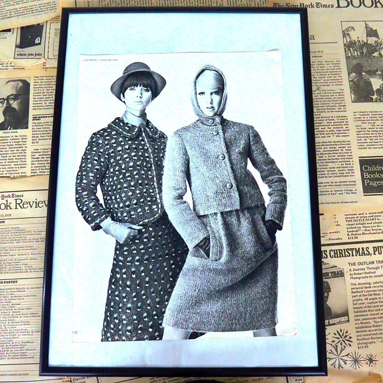 このページは1970年代のファッション雑誌の一部であり、有名なファッションデザイナー、ギ・ラロッシュによる作品を紹介しています。イラストには、フォーマルな雰囲気の中に柔らかな冬の温もりが感じられる、ブラウンのスエードコートを纏った女性モデルが描かれています。コートの内側やフード部分にはファーがあしらわれており、同素材のシンプルなドレスに重ねていることで、洗練された冬のスタイリングが表現されています。このビジュアルは、1970年代特有のクラシックかつモダンなテイストを強調し、冬のおしゃれを楽しみたい方にぴったりの雰囲気です。モノクロームの印刷や、ポーズのバランスからも、当時のファッション広告やエディトリアルらしいエレガントさが漂っています。壁面デコレーションとしても、シックで洗練された空間演出に最適な一枚です。