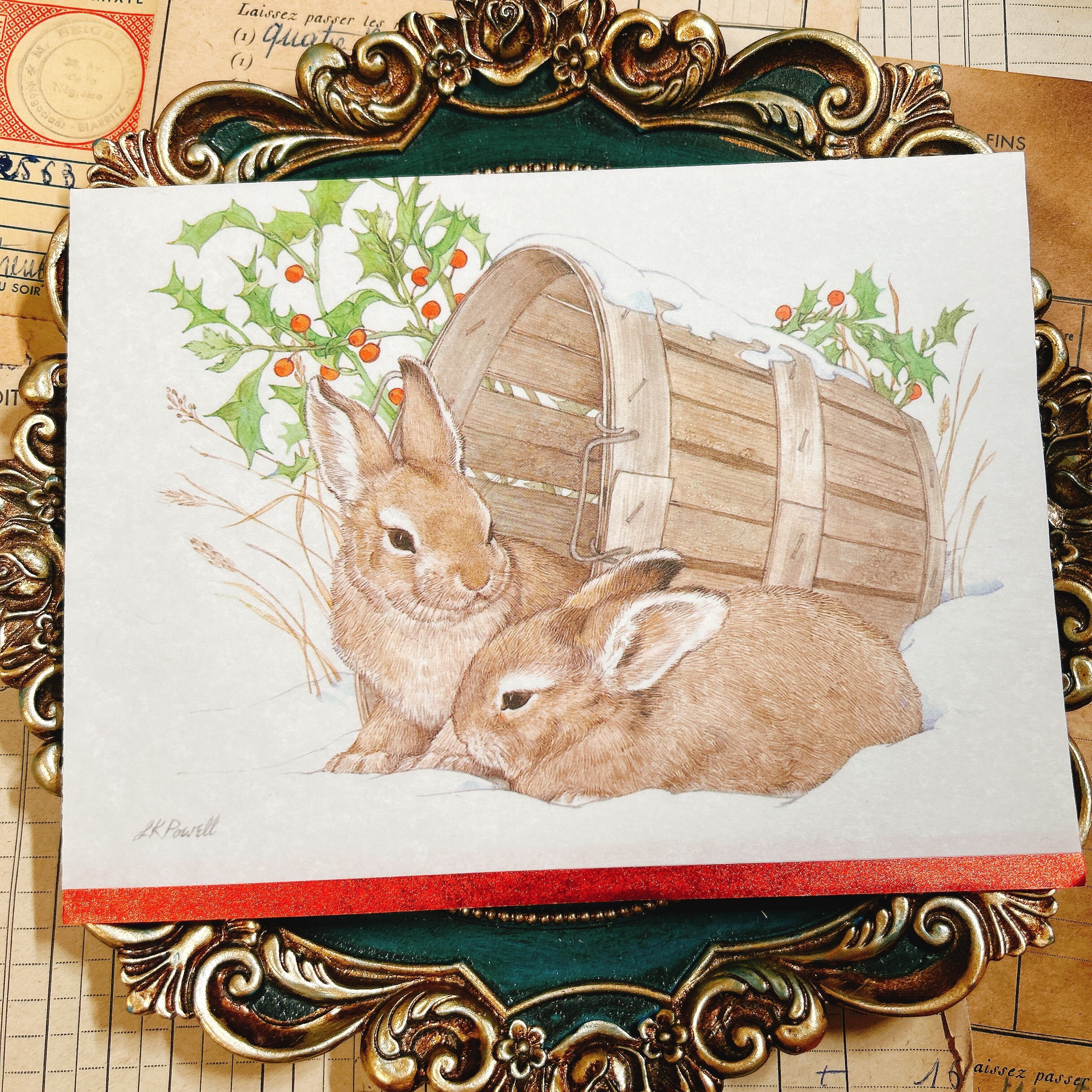 こちらは、冬景色を背景に二匹のうさぎが寄り添う姿を描いた、アメリカ製のグリーティングカードです。表面には木製のバスケットと雪、そしてヒイラギの赤い実が鮮やかに配され、優しいタッチで描かれたうさぎたちが温かな雰囲気を醸し出しています。繊細なイラストは自然の美しさと冬の静けさを感じさせ、飾っても楽しめる一枚です。