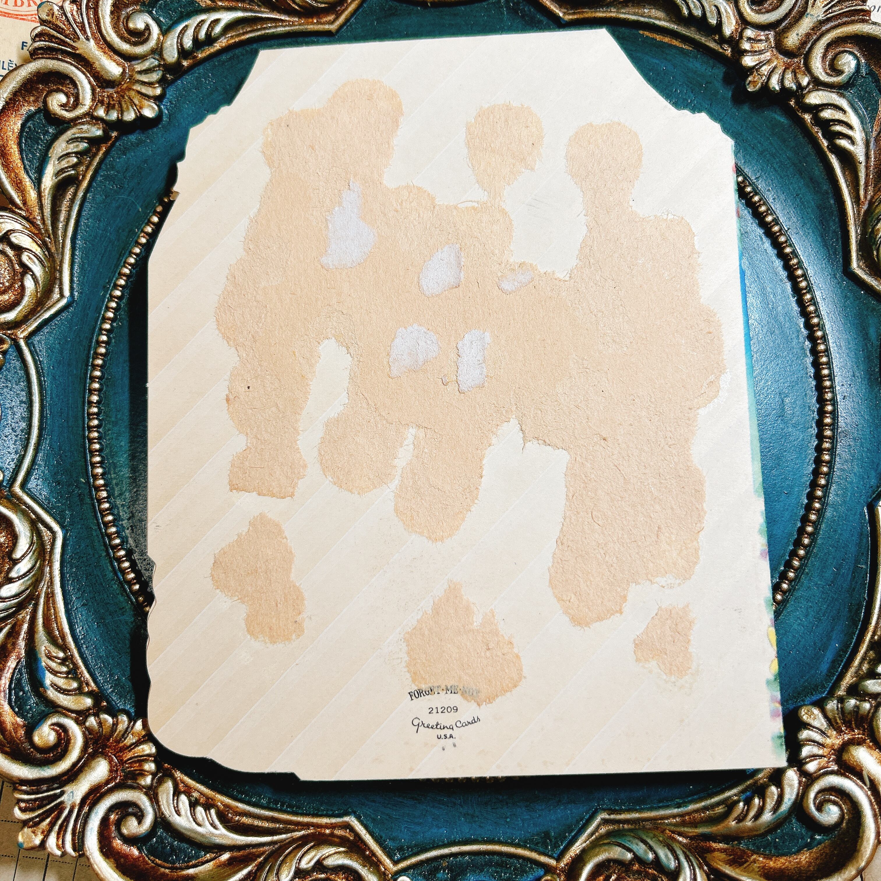 裏面には「Forget-Me-Not Greeting Cards U.S.A.」の表記が確認でき、当時のアメリカ製カード特有の素朴でありながらも繊細なデザインが味わえます。経年による紙の変色や糊跡が見られますが、それもまた80年以上の時を経たアンティークならではの魅力といえるでしょう。ヴィンテージグリーティングカードのコレクションに加えるだけでなく、当時の家族の温かなやり取りを感じられる一点です。