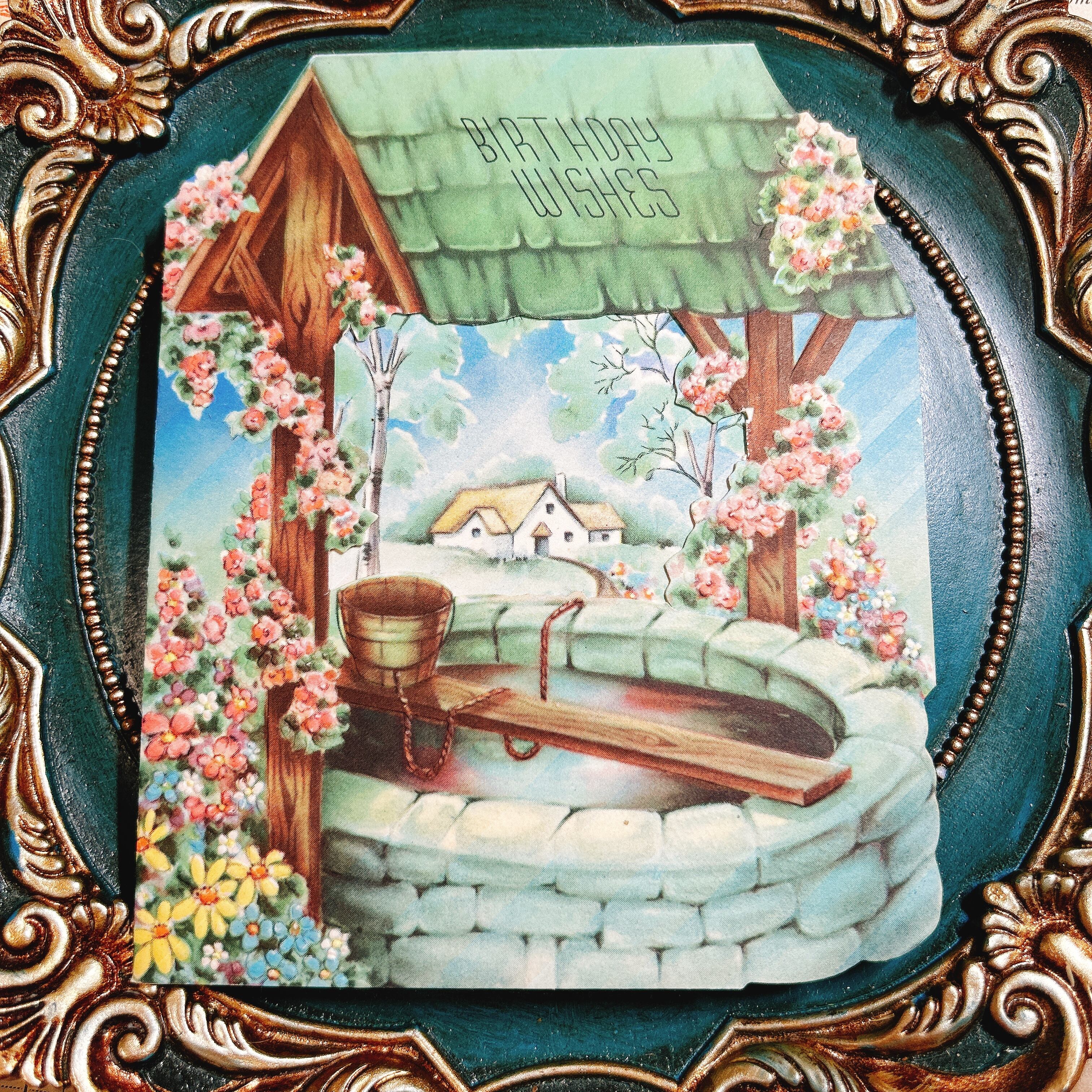 こちらは、1940年代に贈られたバースデーカードで、表紙には「BIRTHDAY WISHES」と描かれた美しい井戸のイラストが広がっています。緑の屋根と満開の花々が飾る井戸の周囲には、のどかな田舎の家が遠景に見え、どこか夢のような牧歌的な雰囲気を感じさせます。カードを開くと、井戸のモチーフを生かしたカットアウトが施され、その横には「I wish I had a wishing well…」と詩的なメッセージが印刷され、持ち主の手書きで「To Elsie, Dad & Mother, July 18 - 1941」と記されています。柔らかなパステル調で描かれた木々や小道が広がる内側のイラストも、時代らしい温かみを伝えてくれます。
