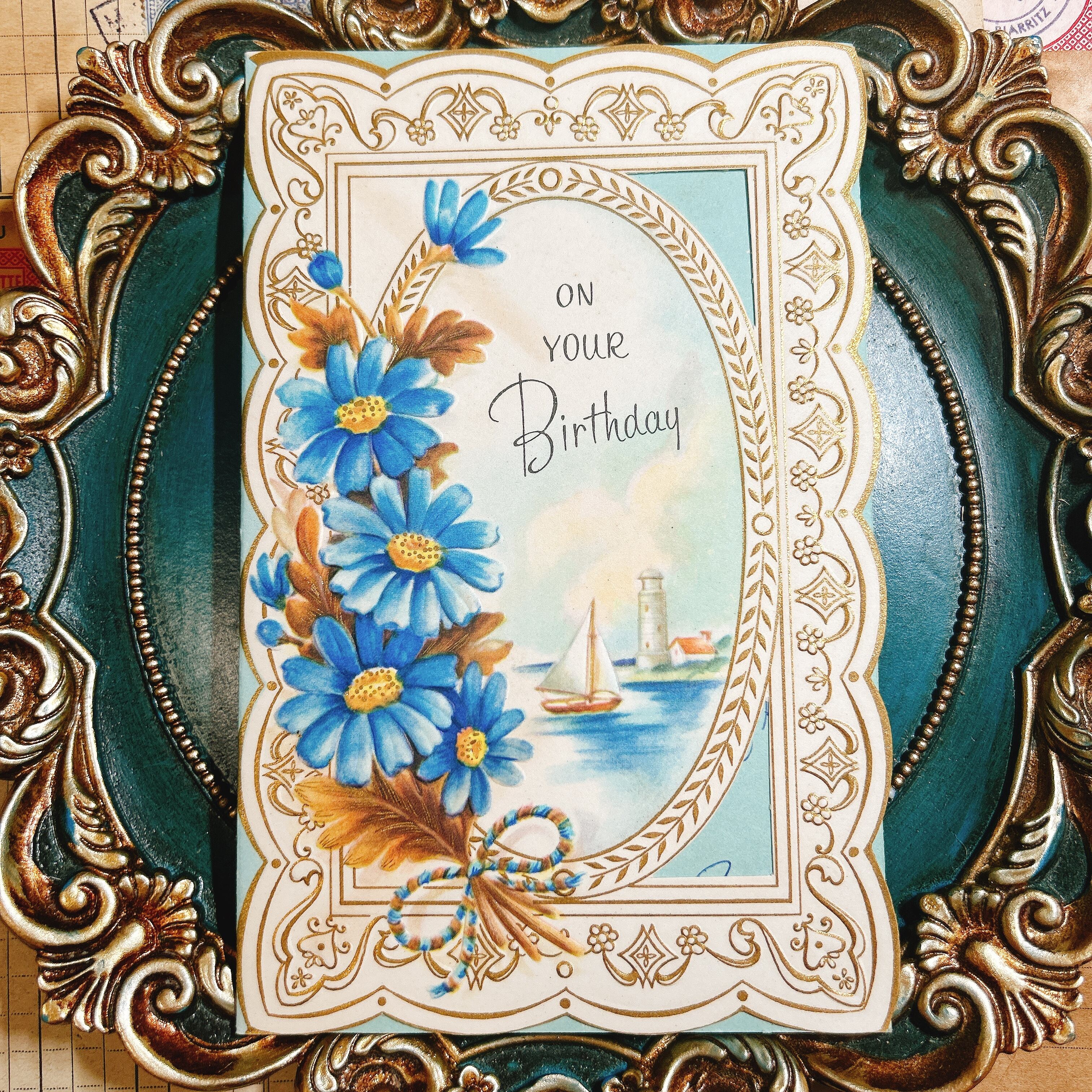 こちらはアメリカ製のヴィンテージバースデーカードで、繊細なエンボス加工と華やかな彩色が施されたデザインが特徴です。表紙には青い花々が縦に連なり、背景には白い灯台とヨットが描かれた爽やかな海辺の風景が広がっています。ゴールドの装飾フレームが全体を縁取り、気品と温かみを兼ね備えた一枚に仕上がっています。