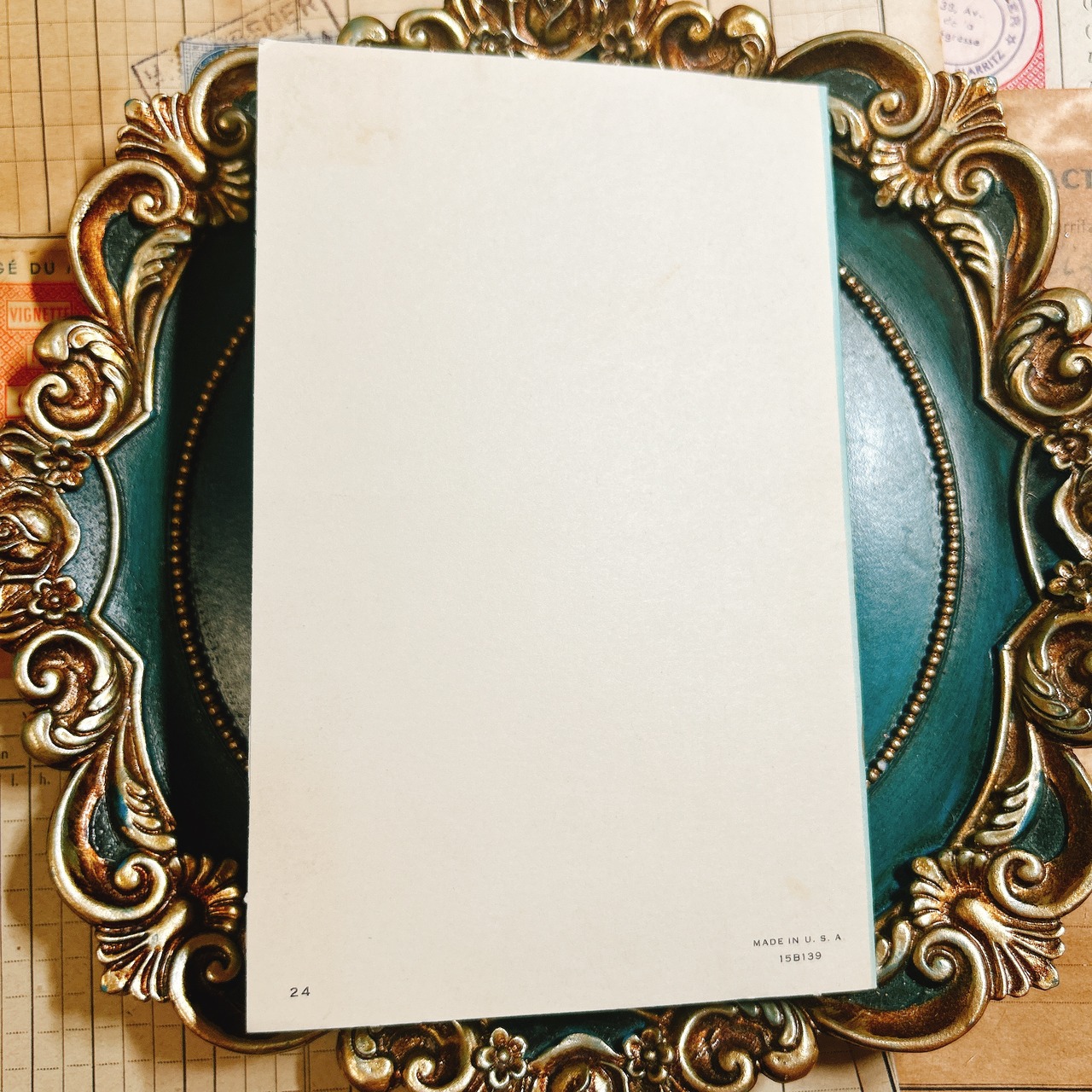 裏面には「MADE IN U.S.A.」の表記と番号が印字されており、製造年代を物語るディテールも残されています。エレガントさと爽やかさが融合したデザインは、誕生日を祝うだけでなく、飾って楽しむインテリアアイテムとしても魅力的です。ヴィンテージらしい紙質と色合いが独特の存在感を放つ、コレクターズアイテムにふさわしい一枚です。