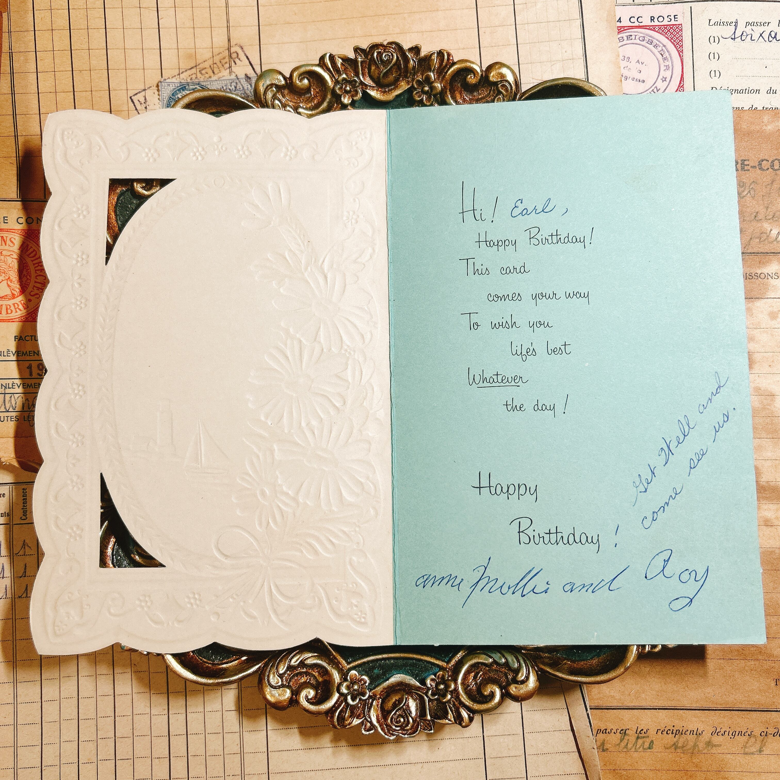 内側にはエンボスによる花や帆船の模様が施されており、淡いブルーの台紙に「Hi Earl, Happy Birthday! This card comes your way to wish you life’s best whatever the day!」というメッセージが印字されています。さらに手書きで「Get well and come see us.」という温かな言葉も添えられ、贈り手の思いやりが感じられます。