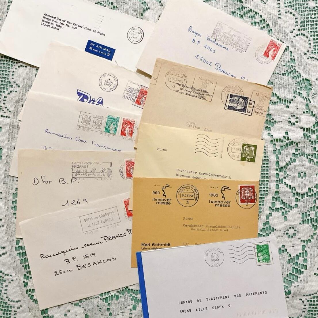 こちらは、世界中から集めたシンプルな封筒10枚セットです。各封筒には、それぞれ異なる国の切手や消印が施されており、歴史的な背景や国際交流の息吹を感じられるアイテムとなっています。ビンテージならではの経年変化が味わい深く、紙の質感や印刷の風合いが一層特別感を引き立てます。
