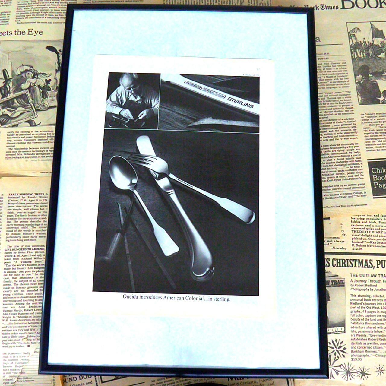 Oneidaは、アメリカを代表するカトラリーおよびテーブルウェアのブランドです。1877年に創業され、伝統的な銀製品の製造技術と革新的なデザインを融合させることで高品質なカトラリーを提供してきました。その製品は家庭用からレストラン・ホテル業界まで幅広く支持されており、耐久性とエレガンスを兼ね備えたアイテムとして定評があります。この広告は、アメリカン・コロニアル様式のデザインを取り入れたスターリングシルバー製カトラリーの新作を紹介しており、Oneidaのクラフトマンシップと伝統へのこだわりが伝わってきます。