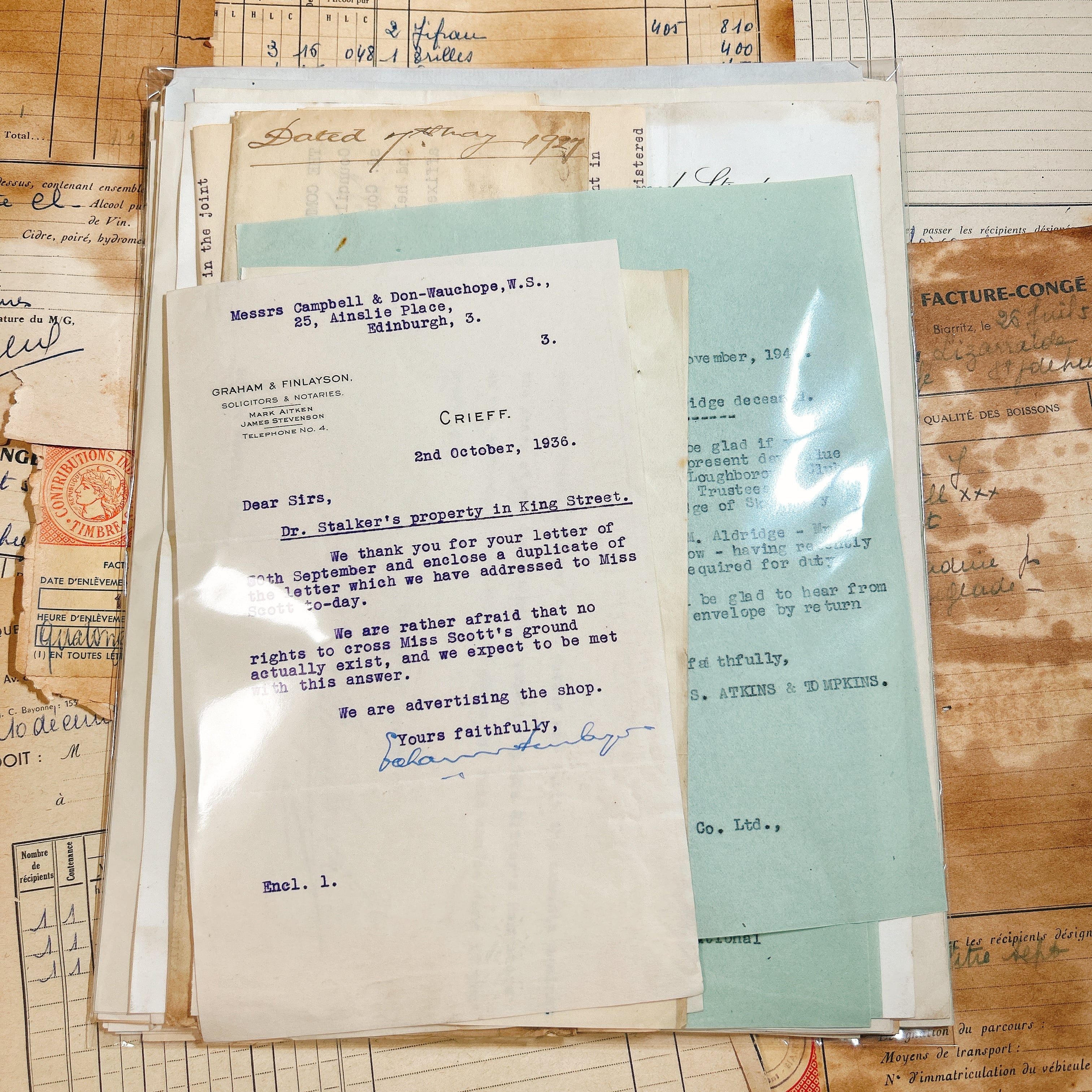紙の種類も様々で、厚みのある公文書用の紙から、薄く透けるようなトレーシングペーパーのような紙まで含まれています。これらは当時のオフィスで使われていた実際の文書であり、装飾用のレプリカではありません。そのため、使用感や汚れ、インクの滲みが見られるものもありますが、それが本物ならではの味わいとなっています。
