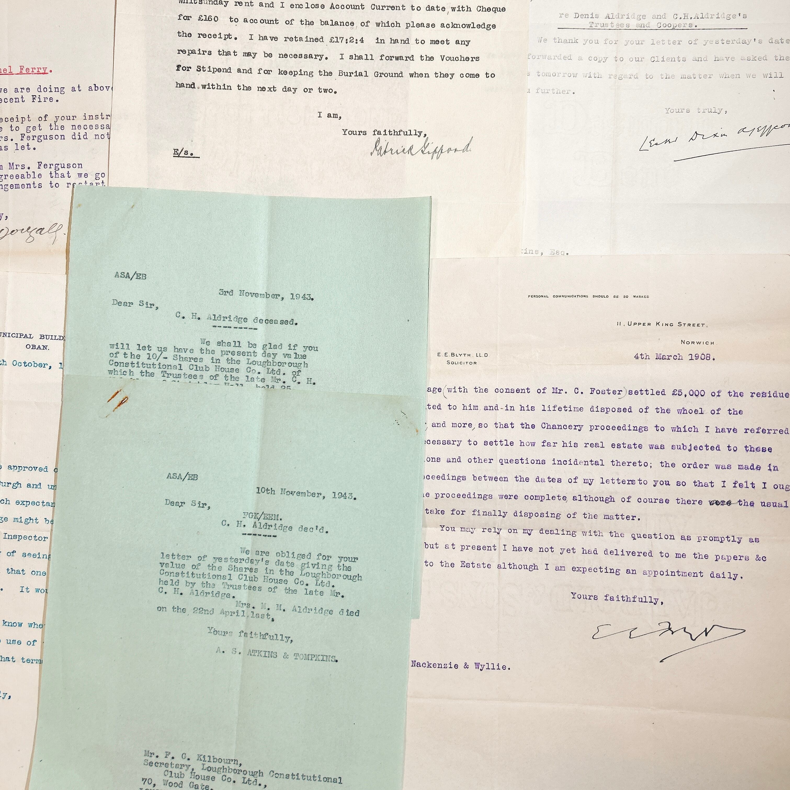 書類の内容は、法律文書や契約書、ビジネスレター、領収書、事務処理に関する記録など、多岐にわたります。いずれも英語で書かれており、手書きの補足や訂正が加えられているものも含まれています。中には青や赤のインクで書き込まれたコメントが見られ、当時の業務がどのように進められていたのかを知る手がかりとなります。手書きの筆跡は、今ではあまり見られなくなった独特の流麗な文字が特徴的で、アンティークの魅力をより一層引き立てています。