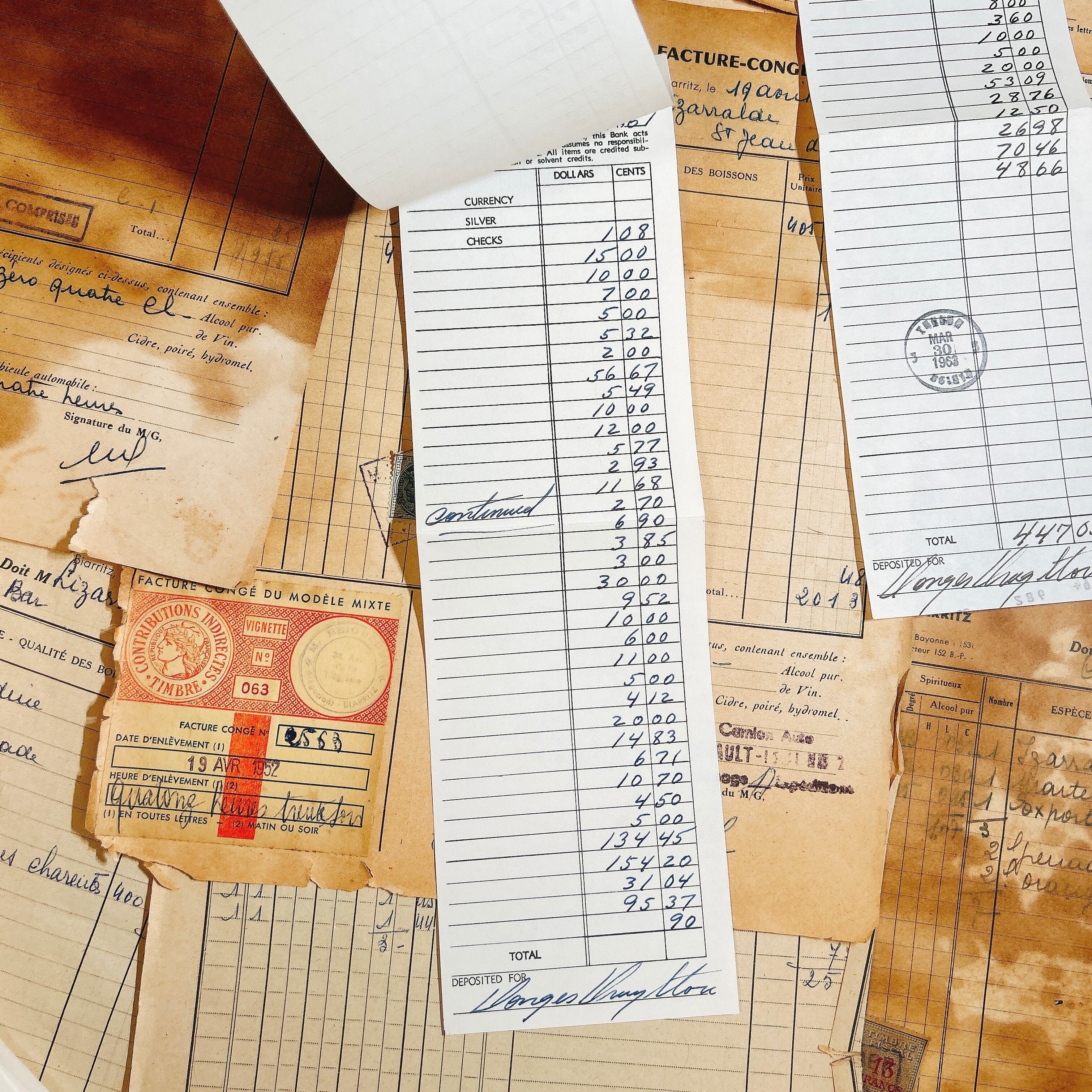 内容は10〜15枚程度で、いずれも同銀行のフォーマットを使用したものですが、日付や金額、筆跡が異なり、一枚ごとに表情の違いがあります。サイズは統一されておらず、一番大きいもので長さ34cm、幅はすべて8.2cmとなっています。縦長の伝票は特に存在感があり、古い紙物らしい手触りと経年の風合いを楽しめます。
