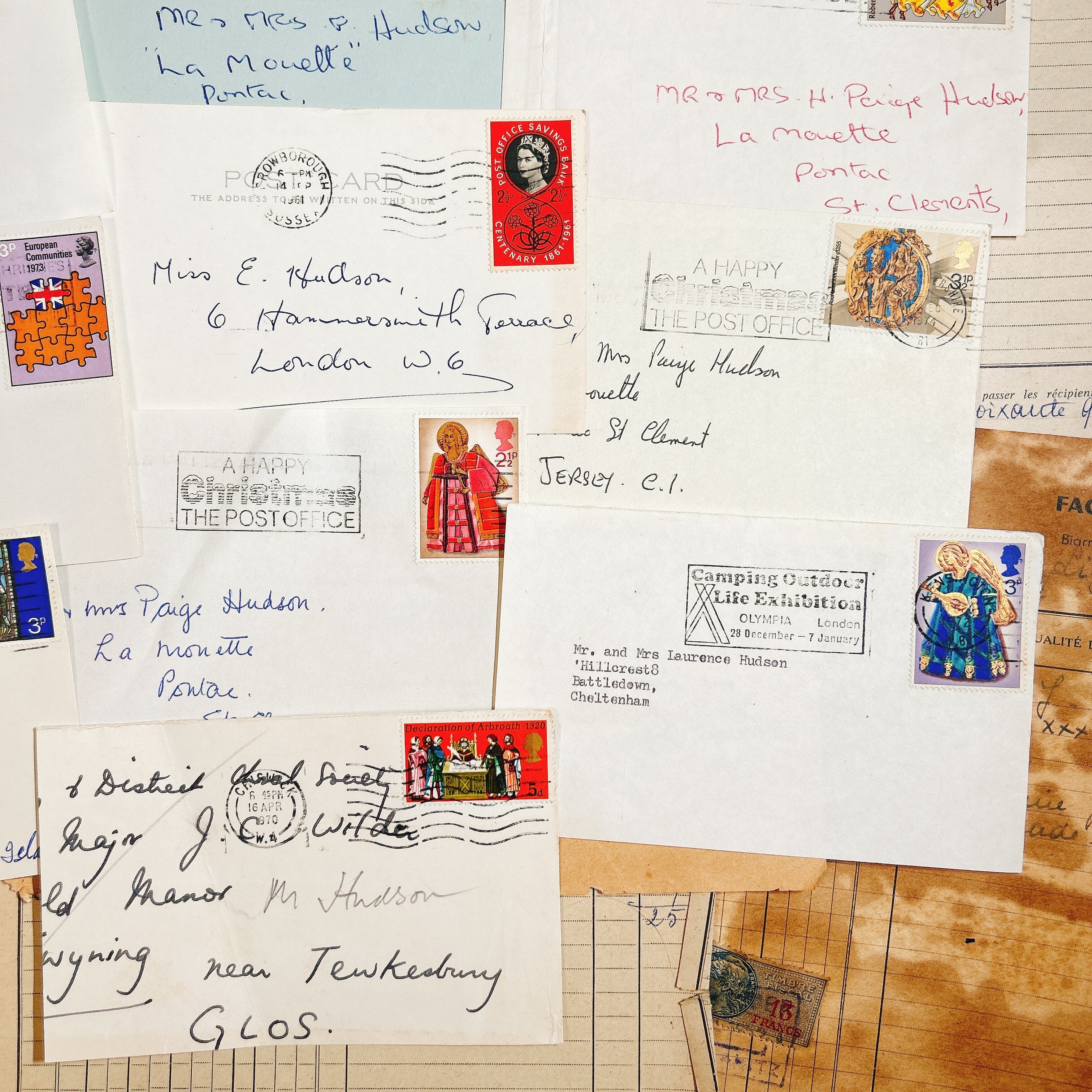 宛名は手書きで書かれており、個人宛に送られたリアルな使用痕跡がそのまま残されています。字体やインクのかすれ具合、紙の質感に経年の雰囲気が漂い、コレクションとしても資料的価値が高い一揃いです。