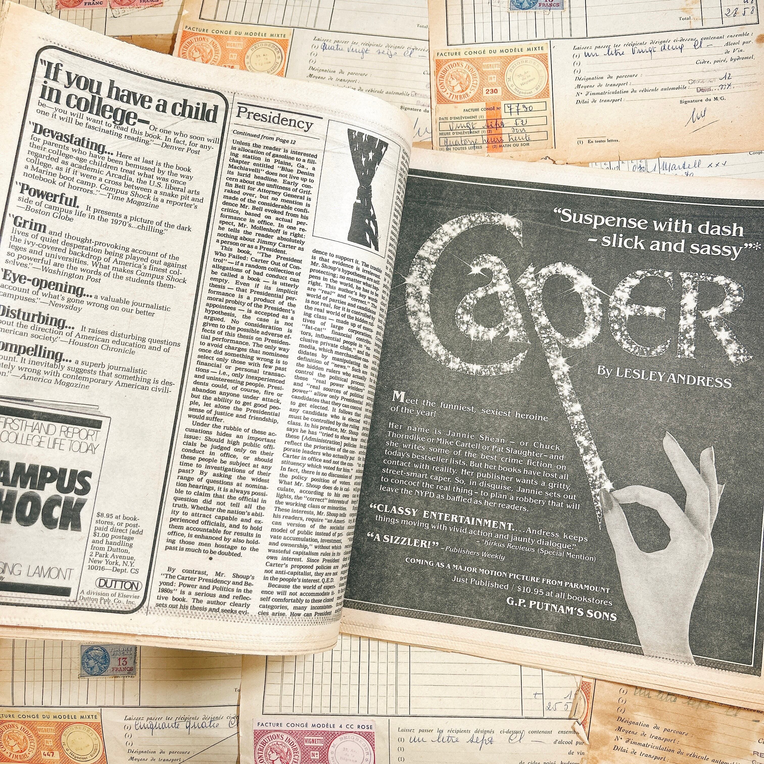 こちらは1980年代『The New York Times Book Review』のヴィンテージ新聞1冊です。ニューヨーク・タイムズが毎週日曜日に発行しているブックレビュー専門の別冊紙で、文学やノンフィクションを中心にした評論や特集が豊富に掲載されています。1980年当時の知的文化を色濃く反映した内容が紙面を彩ります。