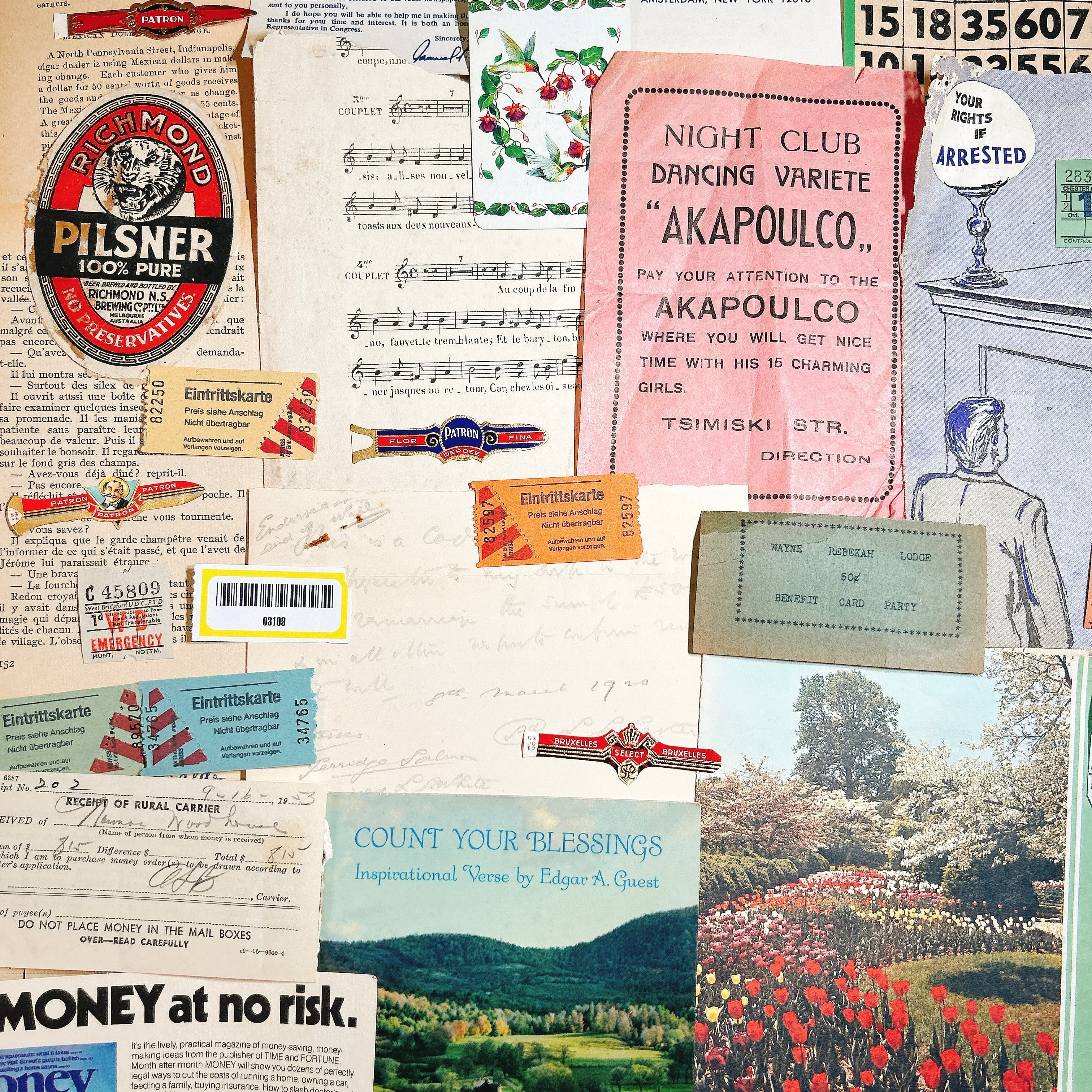 例えば、アメリカの獣医の診察明細には、1950年代の人々の暮らしぶりや、農村部でのやりとりが感じられます。封筒には、切手と手書きの美しい筆致が残され、まるで遠く離れた土地から届いた手紙を開くようなときめきを与えてくれます。ドイツ語で書かれたチケットは、どこかの劇場や列車の記憶を彷彿とさせ、過去の旅人たちの足跡を想像させます。カラフルな広告や、イラストが描かれたカードは、当時の印刷技術や美意識も垣間見せてくれます。