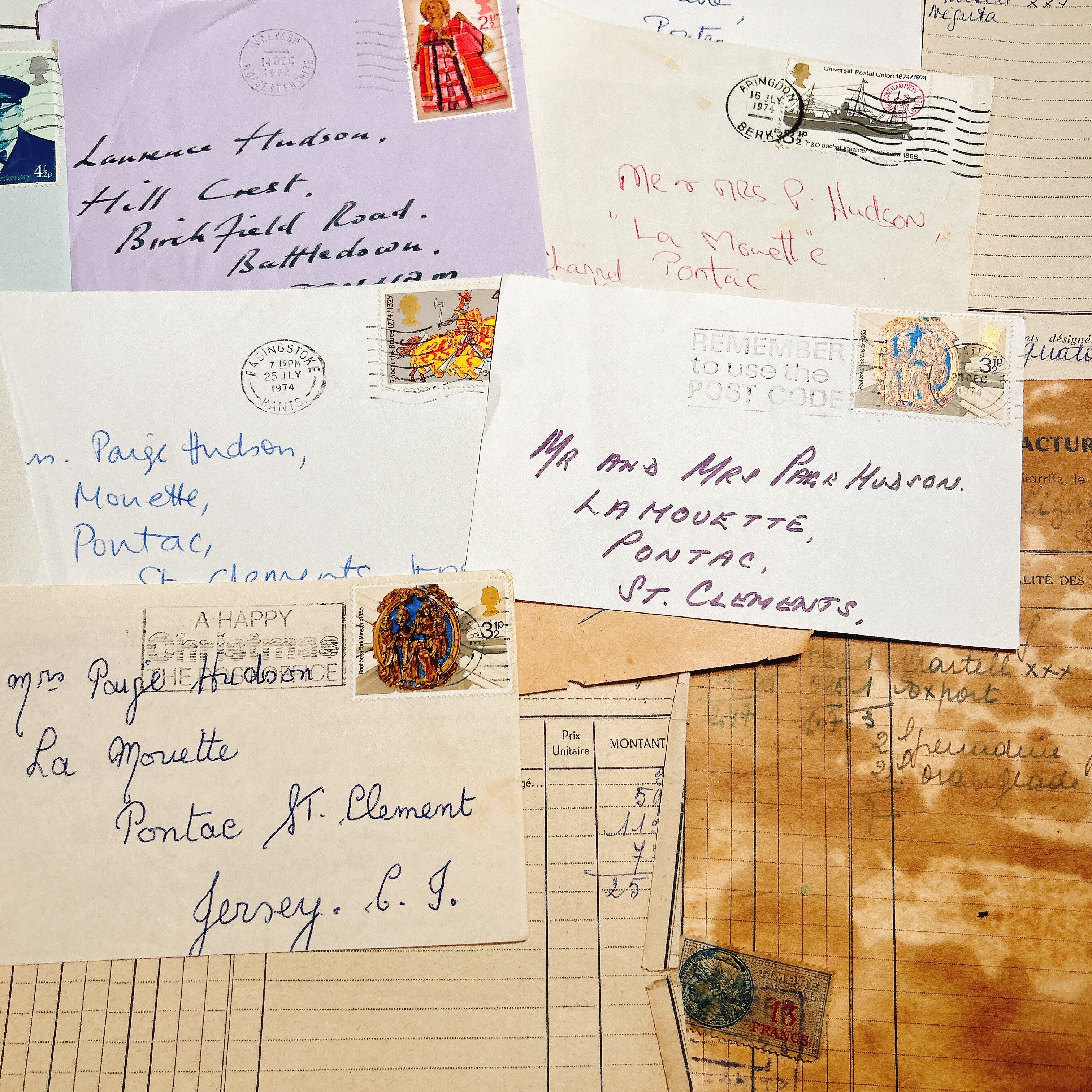 宛名は手書きで書かれており、個人宛に送られたリアルな使用痕跡がそのまま残されています。字体やインクのかすれ具合、紙の質感に経年の雰囲気が漂い、コレクションとしても資料的価値が高い一揃いです。