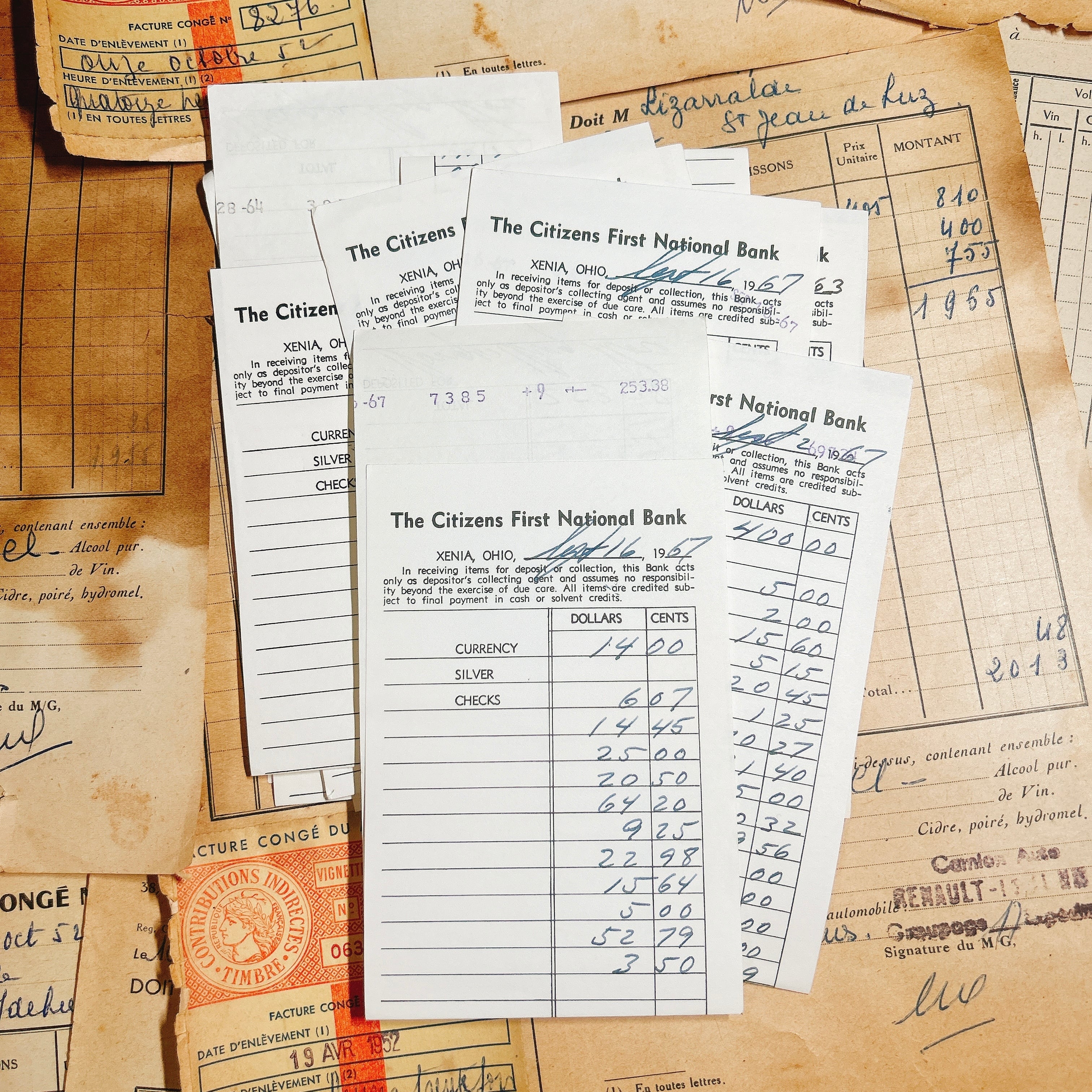 アメリカ・オハイオ州にある「The Citizens First National Bank」の入金伝票がまとまった20グラムセットです。画像に見られるように、1960年代のものを中心に使用済みの記録で、青インクで丁寧に数字や署名が書き込まれています。スタンプも押されており、当時の銀行業務の空気を感じられる資料的価値の高いアイテムです。