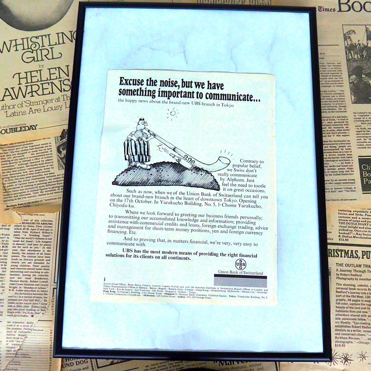 Union Bank of Switzerland(スイス連邦銀行、現UBS)は、スイスに本拠地を置く世界的な金融機関です。伝統的なプライベートバンキングに強みを持ちつつ、商業銀行業務や投資銀行業務、資産運用など幅広いサービスを世界各国で展開しています。顧客第一主義を掲げ、個人から法人、機関投資家まで多様なニーズに応えるため、最新の金融技術とグローバルネットワークを活用しています。変化の激しい国際金融市場において、長年に渡って信頼性と革新性を兼ね備えた経営を行い、多くの顧客から高い評価を得ています。本広告では、東京支店の開設をユーモアを交えて知らせ、グローバルなサービス体制をアピールしています。
