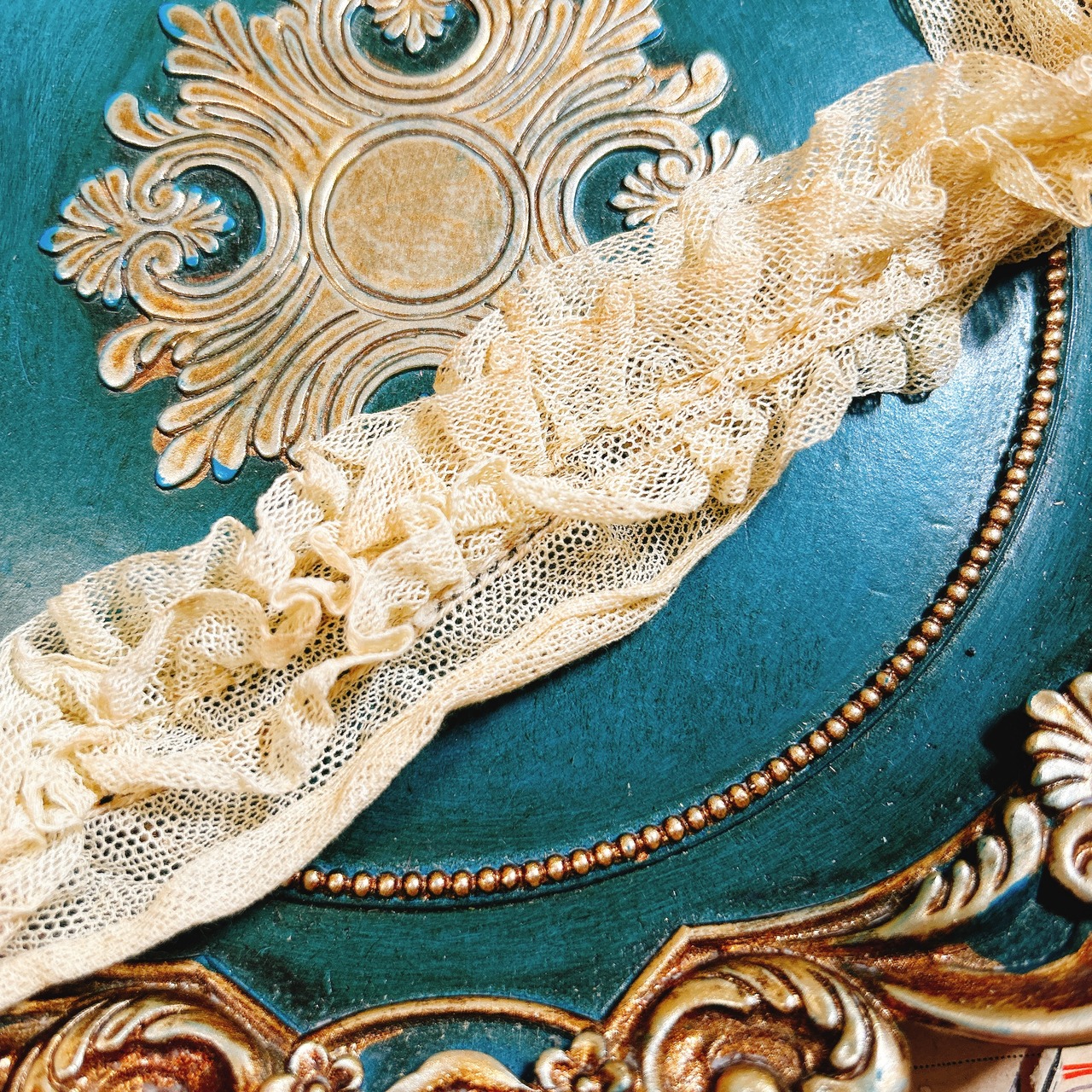 こちらは、淡いバニラクリームのような色味が美しいアンティークレースです。繊細なチュール地に小さな波打つフリルが寄せられ、まるで時を経てやわらかく黄味がかったシフォンのような質感。光を受けるとほんのりと透け、織りの陰影が浮かび上がります。控えめながらも上品な存在感を放ち、ヴィクトリアンやエドワーディアンの装飾を思わせる風合いです。